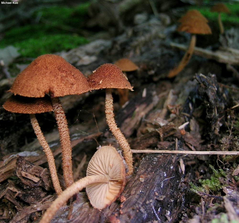 [ Basidiomycota > Agaricales > Tubariaceae > Flammulaster . . . ] Flammulaster erinaceellus by Michael Kuo, 28 January, 2026 Flammulaster? I barely even know her! Flammulaster erinaceellus is a Midwestern and and eastern North American LBM ("little brown mushroom") found on the well-decayed deadwood of hardwoods (usually there is no bark left on the log). It features a finely scaly cap that turns red, then quickly black with the application of KOH, along with gills that are attached to the stem and are pale when young but become brown with maturity. The spore print is brown. Microscopic features include smooth, ellipsoid spores, capitate cheilocystidia, and a pileipellis with cystoderma-like chains of inflated cells. Compare Flammulaster erinaceellus with Flammulaster carpophiluss, which is a little smaller, paler, and grows on leaf litter. Also compare with Pluteus granularis (larger, with a brownish pink spore print and gills that are free from the stem) and Cystoderma granulosum (larger, growing on the ground, spore print white). Flammulaster erinaceella is an alternate spelling. Phaeomarasmius erinaceellus is a synonym. The mushroom appearing in some European literature as Flammulaster erinaceella is actually Flammulaster muricatus (Vellinga 1986). Description: Ecology: Saprobic; growing alone, gregariously, or in small, loose clusters on the well-decayed, decorticated deadwood of hardwoods; causing a white rot; spring through fall; originally described from New York (Peck 1878); probably widely distributed east of the Great Plains. The illustrated and described collections are from Illinois, Indiana, Michigan, and Missouri. Cap: 1–4 cm; convex becoming planoconvex or nearly flat; dry; densely covered with granular to fibrillose scales that often become powdery; dark brown to golden brown or tawny brown; the margin sometimes hung with remnants of the partial veil. Gills: Broadly or narrowly attached to the stem; close; short-gills frequent; whitish to pale yellow at first, becoming brownish to brown. Stem: 25–40 mm long; 2–6 mm mm thick; equal; smooth and whitish to brownish at the apex, but elsewhere covered with granular scales and fibrils like the cap, but often less densely, revealing the paler color of the stem surface underneath; sometimes merely fibrillose; basal mycelium white. Flesh: Yellowish to brownish; unchanging when sliced. Odor: Not distinctive, or slightly radishlike. Chemical Reactions: KOH red, then quickly black on cap surface. Spore Print: Yellowish brown. Microscopic Features: Spores 6–10 x 3–5 µm; ellipsoid; without a pore; smooth; yellowish to orangish brown in KOH; inamyloid. Basidia 20–25 x 6–8 µm; clavate; 4-sterigmate. Cheilocystidia 30–50 x 8–12.5 µm; cylindric, with clavate to subcapitate or capitate apices; smooth; thin-walled; hyaline to brown in KOH. Pleurocystidia not found. Pileipellis composed of chained subglobose to globose, napiform, or ovoid elements 25–50 µm wide, slightly encrusted, reddish brown in KOH. Clamp connections present. REFERENCES: (C. H. Peck, 1878) R. Watling, 1967. (Kauffman, 1918; Murrill, 1924; Overholts, 1927; Smith & Hesler, 1968; Smith, Smith & Weber, 1979; Vellinga, 1986; Lincoff, 1992; Roody, 2003; Kuo & Methven, 2014; Baroni, 2017; Woehrel & Light, 2017.) Herb. Kuo 05300409, 09240505, 09160601, 09120801, 08080902, 05121202. This site contains no information about the edibility or toxicity of mushrooms. |
