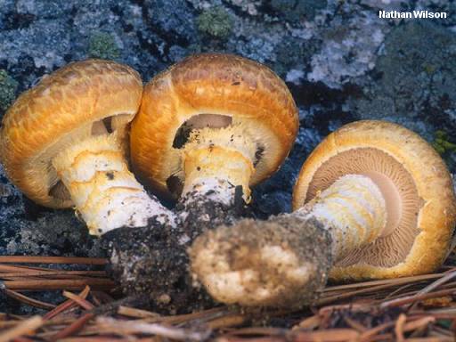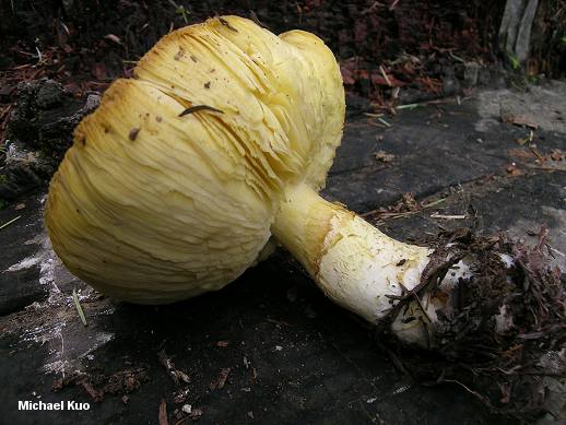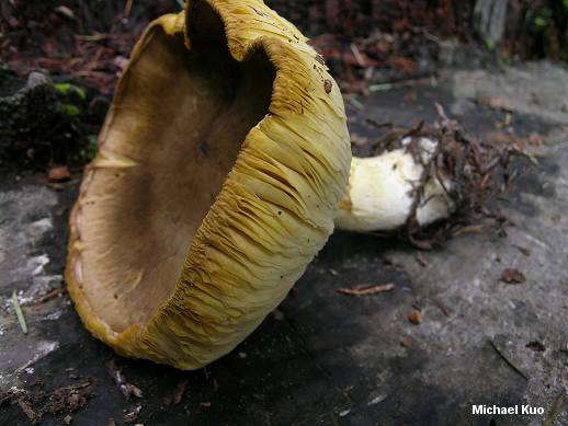 Floccularia albolanaripes [ Basidiomycetes > Agaricales > Tricholomataceae > Floccularia . . . ] by Michael Kuo Formerly known as Armillaria albolanaripes, this western species is quite attractive when young, though it tends to become a bit drab in maturity. It is found under conifers in the Rocky Mountains, especially after fall rains--and under hardwoods (or occasionally conifers) on the West Coast, in fall and winter. The defining features of Floccularia albolanaripes include its medium size and fairly stocky stature; its brownish mature cap, which is adorned with pressed-down fibers; its stem, which is shaggy except near the apex; its white spore print; and, under the microscope, its amyloid, smooth spores. Floccularia straminea is similar, but features brighter yellow colors and fully developed scales, rather than pressed-down fibers. Readers who are fortunate enough to own Alexander Smith's 1949 Mushrooms in Their Natural Habitat (now out of print), as well as the accompanying View-Master reels that illustrate the book, will find Floccularia albolanaripes on Reel 15, in a stunning 3-D photo by William B. Gruber. More than half a century later, virtual reality technology has yet to approach the amazing, feel-like-you're-there sensation of the View-Master, in my humble opinion. An all-white, "albino" form is recorded by Mitchel & Smith (1976), who call it Armillaria albolanaripes f. alba. It has not yet been officially transferred to Floccularia, to my knowledge. Since there is also an albino form of Floccularia straminea, the only feature separating these white forms is the scaliness of the cap (truly scaly in Floccularia straminea; appressed-fibrillose in Floccularia albolanaripes). Description: Ecology: Probably mycorrhizal; usually associated with conifers in the Rocky Mountains, but associated with hardwoods (especially oaks and alders) or conifers on the West Coast; growing alone or scattered; western in distribution; summer and fall in the Rockies; fall and winter on the West Coast. Cap: 4-12 cm; convex when young, becoming planoconvex or flat; slightly sticky at first but soon dry; adorned with pressed-down fibers (especially over the center); in maturity sometimes with a few small scales; often bright yellow when young but usually soon yellow-brown or brown, at least over the center; the margin usually becoming yellow with age. Gills: Attached to the stem by a notch, or nearly free from the stem; close; whitish or yellowish. Stem: 2-8 cm long; up to 2.5 cm thick; more or less equal; whitish and smooth near the apex; sheathed below with shaggy zones of soft scales that are whitish at first but may develop yellowish or brownish tips; sometimes with a poorly defined ring ("the uppermost zone purely by virtue of its position is considered the annulus," says Smith). Flesh: White or a little yellowish; not changing on exposure. Taste: Not distinctive; odor not distinctive. Spore Print: White. Microscopic Features: Spores 5-8 x 4-5 µ; smooth; elliptical; amyloid. REFERENCES: (Atkinson, 1908) Redhead, 1987. (Smith, 1949; Mitchel & Smith, 1976; Smith, Smith & Weber, 1979; Arora, 1986; States, 1990; Lincoff, 1992.) This site contains no information about the edibility or toxicity of mushrooms. |