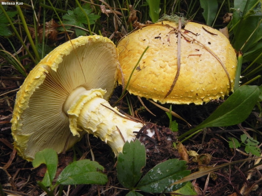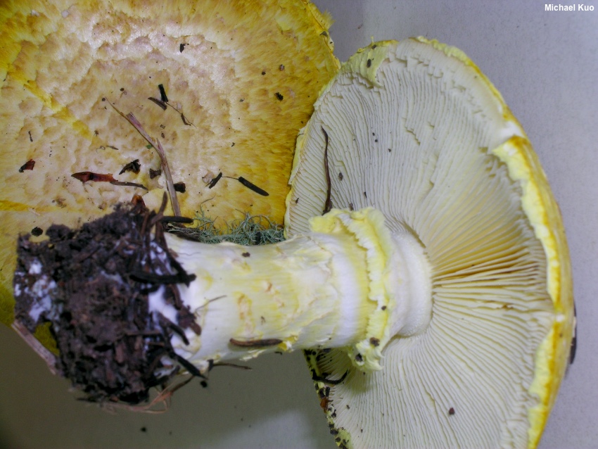 Floccularia luteovirens [ Basidiomycota > Agaricales > Agaricaceae > Floccularia . . . ] by Michael Kuo In North America Floccularia luteovirens is a western species, fairly commonly encountered in aspen stands and spruce-fir forests, especially in grassy areas. When young and fresh it is a gorgeous bright yellow, and its cap and stem are adorned with large, soft scales. Other defining features include its Tricholoma-like stature, its impressive ring, its attached gills, and its amyloid spores. At the moment the official name for our North American species is "Floccularia straminea var. americana f. americana," but that name represents a form of a variety of a species that no longer exists, since Floccularia straminea has long been reduced to synonymy with Floccularia luteovirens. And the logic for separating our North American version from Europe's Floccularia luteovirens (Mitchel & Smith 1976) was based entirely on subtle morphological differences that are easily accounted for by the present-day European concept of Floccularia luteovirens (see Lange 2018 or Læssøe & Petersen 2019). Therefore, in the absence of contemporary, DNA-based evidence, Floccularia luteovirens is the best choice of names for our continent's mushroom. Description: Ecology: Mycorrhizal; growing terrestrially in grassy areas under aspens or conifers; growing alone, scattered, or gregariously; late summer and fall; Rocky Mountains; also distributed in Europe and Asia. The illustrated and described collections are from Colorado. Cap: 5–13 cm; convex when young, becoming planoconvex to nearly flat; dry; covered with bright yellow, appressed fibrillose scales over a whitish ground that is often not visible until old age (the mushroom's old age, not yours); the margin adorned with shaggy partial veil remnants. Gills: Attached to the stem, usually by a notch; close or crowded; short-gills frequent; pale yellow; edges often jagged. Stem: 5–12 cm long; 1.5–3.5 cm thick; equal, or enlarging toward the base; white and bald near the apex; sheathed below with shaggy yellow scales over a whitish ground; with a shaggy, yellow, double ring; basal mycelium white and prominent. Flesh: White; not changing on exposure; firm when young and fresh. Odor and Taste: Not distinctive. Chemical Reactions: KOH on cap surface negative or erasing yellow. Dried Specimens: Cap and stem lose all yellow shades and become dull whitish; gills become dirty brownish. Spore Print: White. Microscopic Features: Spores 6–7 x 3.5–4.5 µm; ellipsoid; smooth; weakly to moderately amyloid. Lamellar trama parallel. Basidia 4-sterigmate. Hymenial cystidia not found. Pileipellis a cutis or collapsing trichoderm; elements 4–10 µm wide, smooth, thin-walled, hyaline in KOH; clamp connections present; terminal cells with rounded apices. REFERENCES: (Albertini & Schweinitz, 1805) Pouzar, 1957. (Smith, 1975; Mitchel & Smith, 1976; Smith, Smith & Weber, 1979; States, 1990; Phillips, 1991/2005; Lincoff, 1992; Kuo & Methven, 2010; Evenson, 2015; Cripps, Evenson & Kuo, 2016; Lange, 2018; Læssøe & Petersen, 2019.) Herb. Kuo 08060509, 08150701, 08201201, 08141510. This site contains no information about the edibility or toxicity of mushrooms. |