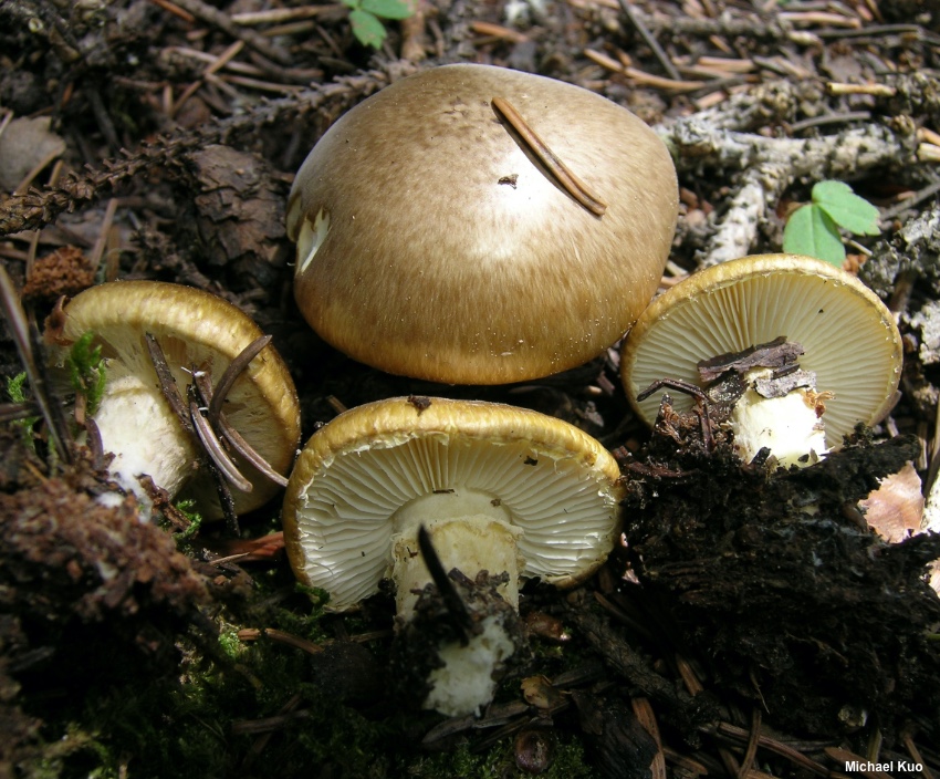 Floccularia pitkinensis [ Basidiomycota > Agaricales > Agaricaceae > Floccularia . . . ] by Michael Kuo Described in 1976 by Colorado mushroom expert Sam Mitchel and mycology icon Alexander Smith, Floccularia pitkinensis was originally collected in Aspen, which is in Pitkin County, Colorado. Like other species of Floccularia it features Tricholoma-like stature, attached gills, a white spore print, a sheathed stem, and amyloid spores. It can be distinguished from other Floccularia species on the basis of its cap, which is dingy brownish yellow and only a little scaly; Floccularia straminea is bright yellow and very scaly, while Floccularia albolanaripes can be similarly colored but usually somewhat brighter, especially when young—and the cap margin of Floccularia albolanaripes is usually yellow, even in maturity. Under the microscope, Floccularia pitkinensis has hyphae in the pileipellis that become a bit inflated, causing them to be constricted at the septa (see the illustration to the right), while the corresponding hyphae in Floccularia albolanaripes do not become inflated. Armillaria pitkinensis is a previous name. Description: Ecology: Mycorrhizal with Engelmann spruce and subalpine fir; terrestrial, growing alone or scattered; late summer and fall; southern Rocky Mountains. The illustrated and described collection is from Colorado. Cap: 2–4 cm; convex when young, becoming broadly convex; dry and shiny; innately appressed-fibrillose in sub-scaly, radial patterns; dull brownish golden; the margin adorned with white partial veil remnants. Gills: Attached to the stem by a notch; close or nearly distant; short-gills frequent; white. Stem: 2–3 cm long; about 1 cm thick; more or less equal; bald near the apex; sheathed below with shaggy, soft, white scales; with a bent-back, whitish ring; white. Flesh: White; not changing on exposure. Odor: Not distinctive. Chemical Reactions: KOH on cap surface negative. Spore Print: White. Microscopic Features: Spores 6–8 x 3.5–5 µm; ellipsoid; smooth; weakly amyloid. Lamellar trama parallel. Basidia 30–35 x 6–7 µm; 4-sterigmate. Hymenial cystidia not found. Pileipellis a cutis; elements 5–10 µm wide, smooth, thin-walled, hyaline in KOH, often constricted at septa; terminal elements narrowing to a subacute apex; clamp connections present. REFERENCES: (Mitchel & Smith, 1976) Bon, 1990. (Mitchel & Smith, 1976; Smith, Smith & Weber, 1979.) Herb. Kuo 08130804. This site contains no information about the edibility or toxicity of mushrooms. |