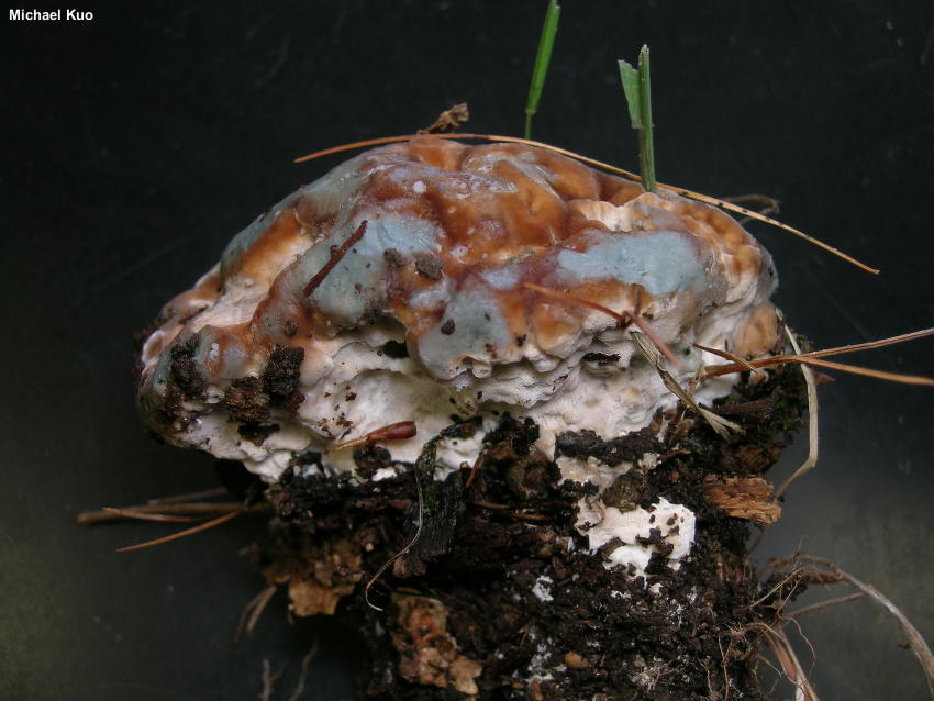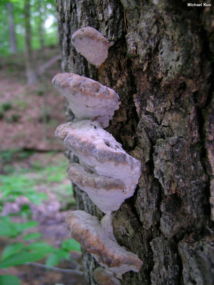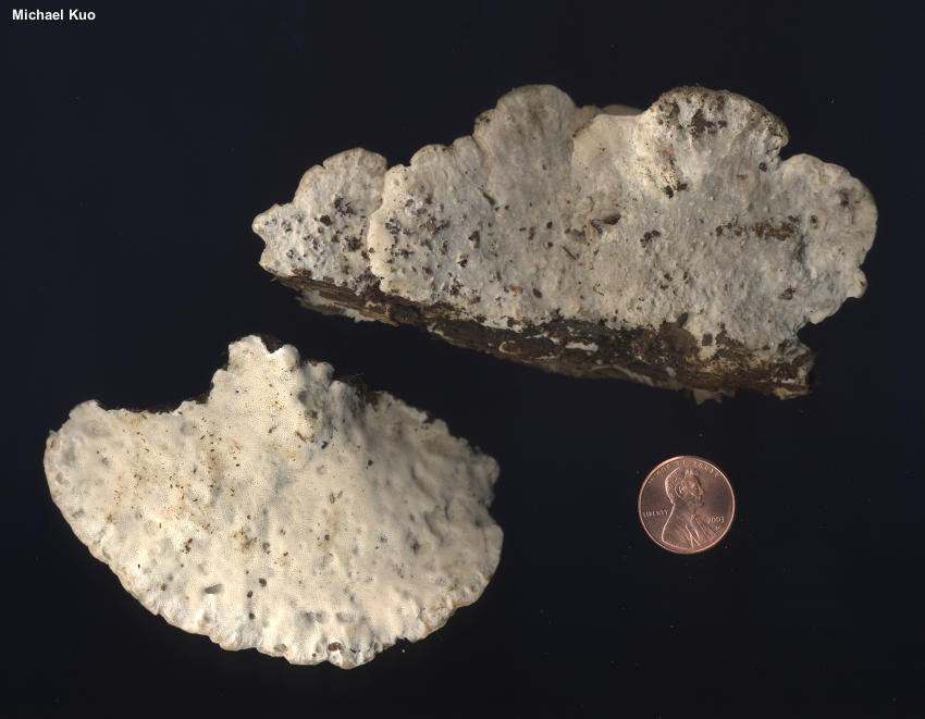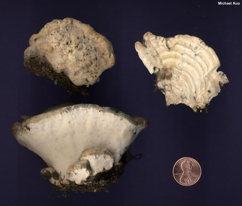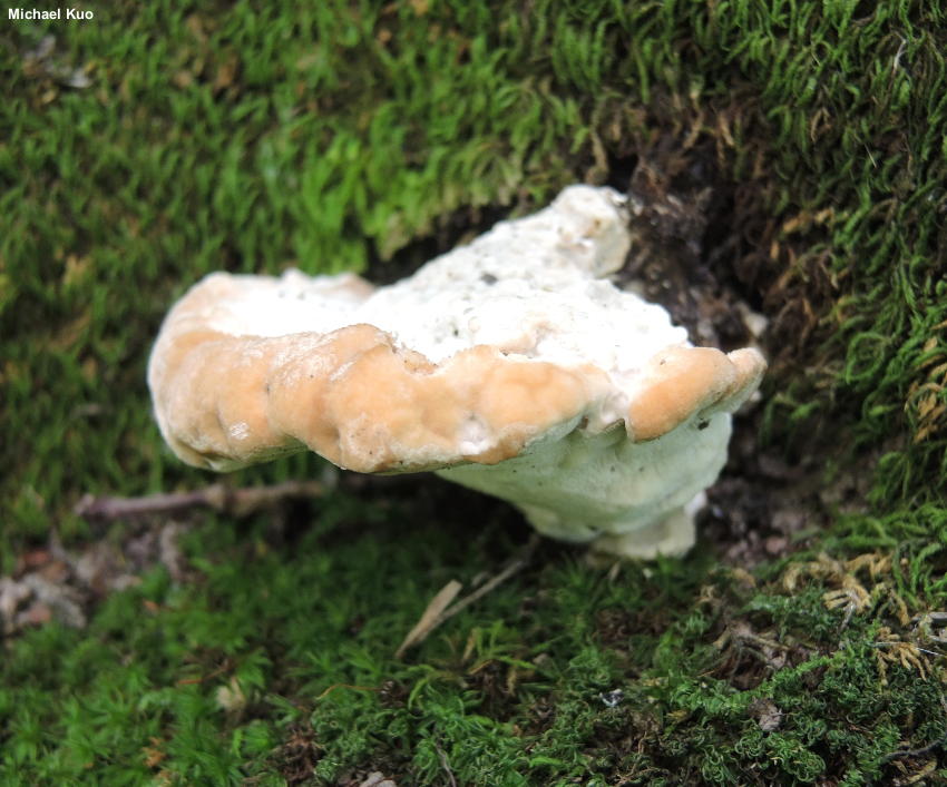 Fomitopsis spraguei [ Basidiomycota > Polyporales > Fomitopsidaceae > Fomitopsis . . . ] by Michael Kuo When young and fresh, Fomitopsis spraguei is a small, distinctive polypore from eastern North America's oak-based hardwood forests. It features a lumpy, whitish to grayish cap with an orangish edge that stains grayish green, along with a similarly staining pore surface—and, when sliced and exposed, the fresh flesh is distinctively zoned with layers of whitish and grayish. Fomitopsis spraguei is annual, but it hangs around for a long time, which means that one often finds it in its not-so-fresh state, when the green staining no longer occurs and the flesh is less clearly zoned. At this point the species is much more difficult to identify with certainty, and one must rely on the fact that it causes a brown, cubical rot (rather than a white, stringy rot)—and on microscopic features, including its broadly ellipsoid spores and trimitic hyphal system. Readers who are polypore buffs and own the North American "polypore bible" (Gilbertson & Ryvarden, 1986 & 1987) may notice that green staining and zonate flesh are not mentioned for Fomitopsis spraguei. However, both Murrill (1907) and Overholts (1953) document these features. Polyporus spraguei, Trametes spraguei, and Tyromyces spraguei are previous names. Description: Ecology: Saprobic on the dead and living wood of oaks and other hardwoods; also possibly parasitic on living trees; causing a brown cubical rot; growing alone or gregariously; annual; spring through fall; widely distributed in North America east of the Rocky Mountains. The illustrated and described collections are from Illinois and Ohio. Cap: 2–10 cm across; up to 6 cm deep; semicircular to nearly circular or irregular in outline; planoconvex to flat or shallowly depressed; rugged and pocked; very finely fuzzy toward the margin when young, becoming finely fuzzy overall; dry, or, when very fresh, sometimes exuding clear droplets of liquid; grayish overall, becoming whitish; fresh margin brownish orange; when young and fresh bruising grayish green, especially near the margin. Pore Surface: Grayish white; bruising grayish green when fresh, but bruising brownish at maturity; 1–3 angular pores per mm; tubes 2-4 mm deep. Stem: Usually absent, but occasionally present as a stubby, lateral extension; 1–2 cm long; 1–2 cm thick; whitish to brownish; fuzzy. Flesh: Whitish to watery gray or slightly bluish; when fresh and young clearly divided into zones of whitish and grayish; unchanging when sliced; soft-leathery, becoming tougher with age. Odor and Taste: Odor fragrant; taste not distinctive. Chemical Reactions: KOH negative on flesh; yellowish on cap surface and pore surface. Microscopic Features: Spores 5–8 x 4–5 µm; ellipsoid; smooth; hyaline in KOH; inamyloid. Hyphal system trimitic: generative hyphae 2–4 µm wide, thin-walled, clamped, smooth; skeletal hyphae 4–6 µm wide, thick-walled, smooth; binding hyphae 2–4 µm wide, thick-walled, non-septate. REFERENCES: (Berkeley & M. A. Curtis, 1872) Gilbertson & Ryvarden, 1985. (Saccardo, 1888; Murrill, 1907; Overholts, 1953; Gilbertson & Ryvarden, 1986; McNeil, 2006; Binion et al., 2008.) Herb. Kuo 07120303, 08200501, 06071004, 07171004, 07081104, 09171401, 07111601. This site contains no information about the edibility or toxicity of mushrooms. |