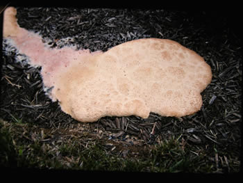 crust-like sheets or cushion-like iregular masses on stumps,