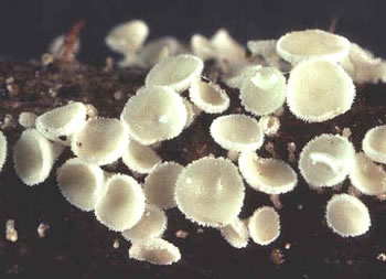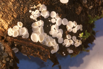 Figure 1. Clusters of Dasyscyphus virgineus on decaying