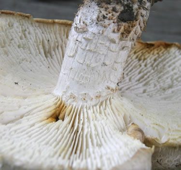 Gills: Attached; white to yellowish; edges serrate; bruising