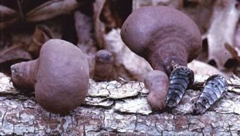 irregularly shaped) fruit bodies are grayish-white to pinkish-