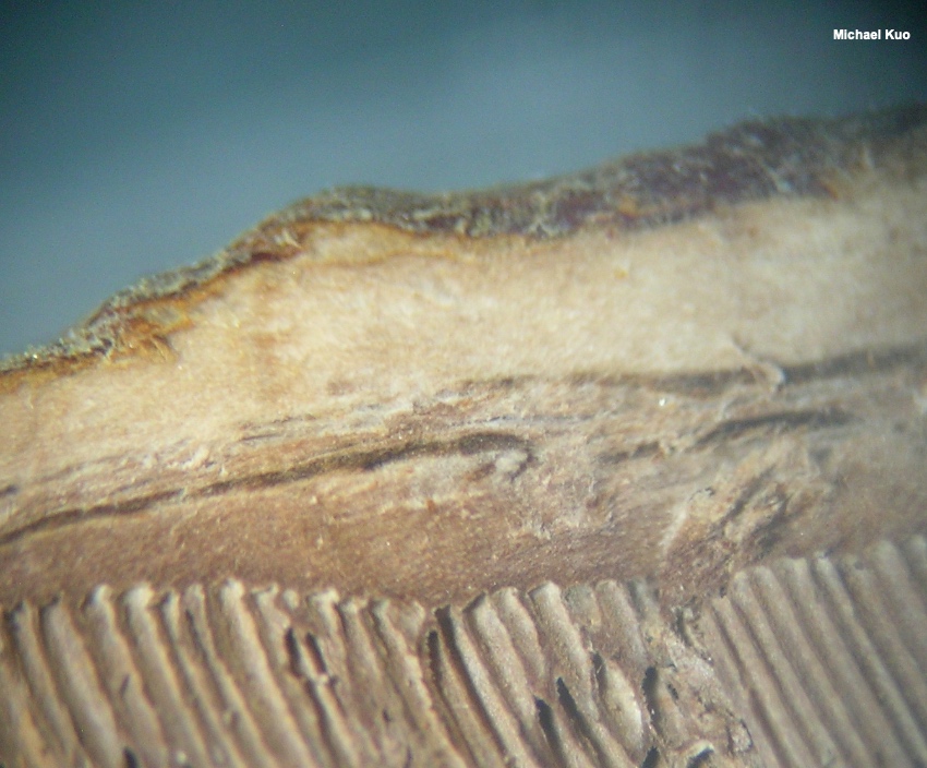 Ganoderma identification relies on many characters that are accessible without recourse to microscopic work, although measuring spores is also sometimes informative. The color of the flesh, when dried, ranges from white to pale brown to dark brown, and picking one of these three colors is important. In some species the flesh features "concentric growth zones" (illustration), which can be seen as textural zonations when the surface has been sliced cleanly with a razor blade (a magnifying glass will help in assessing this feature). Another feature of the flesh in some Ganoderma species is the presence of "melanoid bands" (illustration), which are blackish, sub-shiny bands that, like the concentric growth zones, may be difficult to spot without a cleanly-cut edge and a magnifying glass. Other useful features in Ganoderma identification include the presence or absence of a stem, the kind of wood the mushroom is growing on, and the known ranges of the species. However, the stem (or pseudostem, or not-stem) is in my experience a very unreliable character, since species frequently develop stems when they're not "supposed to," and neglect to develop them when they "should."