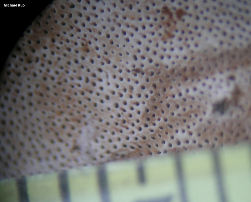 Ganoderma applanatum [ Basidiomycota > Polyporales > Polyporaceae > Ganoderma . . . ] by Michael Kuo Many people have seen Ganoderma applanatum at one time or another; it is widely distributed and fairly common—typically seen at the bases of hardwood stumps or on hardwood logs. It is sometimes known as the "artist's fungus," since its white to gray pore surface bruises brown and retains the bruising for years if the mushroom is picked and brought inside. I have seen very intricate and beautiful etchings on Ganoderma applanatum, in craft stores and yard sales. My own attempts at Ganoderma art, however, have not been very beautiful—unless you call abusive woodland notes for my mushrooming buddies "beautiful." Distinguishing features for Ganoderma applanatum include its unvarnished, furrowed and lumpy, dull brown cap surface; its white to grayish pore surface, which bruises brown; and its woody, brownish or cinnamon flesh. It is perennial, and individuals can develop for many years by producing a new spore-producing tube layer beneath the previous year's layer (see the sixth illustration). Ganoderma lobatum is similar, but features a comparatively thin cap with an upper surface that is somewhat softer (it can be punctured with one's thumb); additionally it grows a new cap-like structure beneath the previous year's growth, rather than adding a tube layer beneath the previous year's layer. Ganoderma brownii is a similar mushroom found on California hardwoods (especially laurel); it has a hoof-shaped fruiting body and larger spores. "Ganoderma megaloma" is a name sometimes applied to North American collections of Ganoderma applanatum in online resources, but no published, peer-reviewed study supports use of this name in place of Ganoderma applanatum. Description: Ecology: Saprobic and sometimes parasitic; growing alone or in groups on decaying hardwood logs and stumps, or from the wounds of injured, living (for a while, anyway) trees; producing a white to straw-colored rot of sapwood and heartwood; found on most species of hardwoods; perennial; common and widely distributed in North America. The illustrated and described collections are from Illinois, Indiana, and Colorado. Cap: 10–30 cm across; 8–14 cm deep; more or less semicircular in outline, or irregular; surface with a dull, unvarnished outer crust, often furrowed in "zones," brownish to grayish brown; bald. Pore Surface: White to grayish or pale brownish; bruising yellow to brownish, then dark brown; becoming dirty brown in age; with 4–6 tiny, circular pores per mm; tubes in annual layers, separated by brown tissue, each layer 0.5–2 cm deep, with older layers often stuffed with white mycelial material. Stem: Usually absent; if present, lateral and very stubby. Flesh: Thin; brown to cinnamon brown (rarely whitish); woody. Odor and Taste: Not distinctive. Chemical Reactions: KOH instantly black on cap surface, flesh, and tubes. Spore Print: Brown to orangish brown. Microscopic Features: Spores 6–9 x 4–5 µm after the collapse of the hyaline vesicular appendix; more or less ellipsoid, with a truncated end; appearing double-walled, with a series of "pillars" between the walls; finely stippled; inamyloid; brown in KOH. Cystidia and setae not found. Hyphal system trimitic. Clamp connections present. REFERENCES: (Persoon, 1799) Patouillard, 1887. (Saccardo, 1888; Overholts, 1953; Smith, Smith & Weber, 1981; Arora, 1986; Breitenbach & Kränzlin, 1986; Gilbertson & Ryvarden, 1986; States, 1990; Lincoff, 1992; Horn, Kay & Abel, 1993; Barron, 1999; Roody, 2003; McNeil, 2006; Miller & Miller, 2006; Binion et al, 2008; Niemelä & Miettinen, 2008; Kuo & Methven, 2014; Evenson, 2016; López-Peña et al., 2016; Siegel & Schwarz, 2016; Justo et al., 2017.) Herb. Kuo 02191001, 10201808. Herb. DBG RMNP 2009-084; ROMO 2012 5026-32, 5028-24. This site contains no information about the edibility or toxicity of mushrooms. |