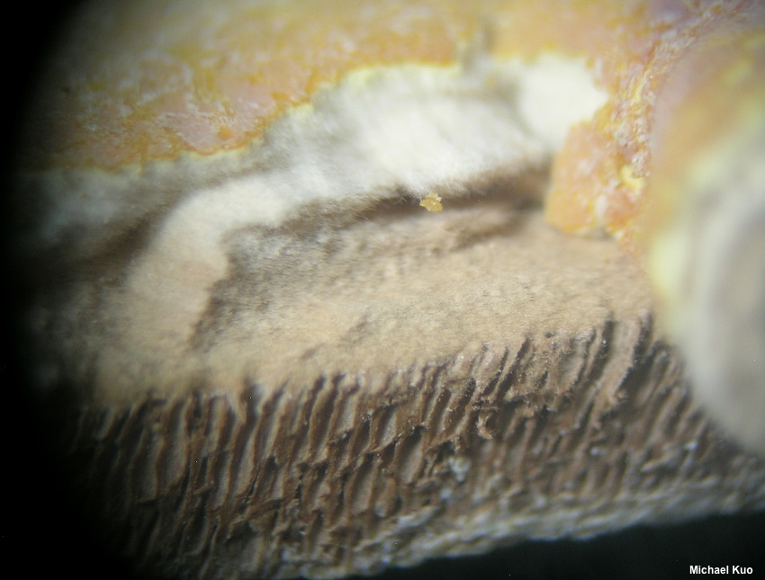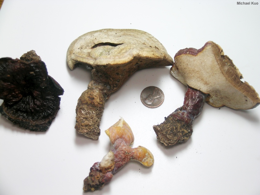 Ganoderma curtisii meredithiae [ Basidiomycota > Polyporales > Polyporaceae > Ganoderma . . . ] by Michael Kuo This gorgeous Ganoderma is actually just a form of Ganoderma curtisii; like the latter mushroom it has a shellacked, brownish red cap, a tendency to produce a well-developed stem, and melanoid bands (see discussion) in its flesh. However, while Ganoderma curtisii grows on the wood of hardwoods and is widely distributed from the Rocky Mountains eastward, Ganoderma curtisii meredithiae grows on the wood of pines and is limited to the southeastern United States. Ganoderma meredithiae was first described as a new species in 1988 (Adaskaveg & Gilbertson), but recent DNA investigation by Loyd and collaborators (2018) failed to support the idea that Ganoderma meredithiae is a phylogenetic species distinct from Ganoderma curtisii. The authors proposed Ganoderma curtisii f. sp. meredithiae as an "informal classification," reducing Ganoderma meredithiae to the status of a "special form" of Ganoderma curtisii. Because the designation is informal, the combination will not be found in official taxonomic registers (MycoBank or Index Fungorum, for example), creating a bit of confusion because Ganoderma meredithiae is still a "good species" in these indices, since Loyd and collaborators did not propose deprecating synonymy. Thanks to Linda Goodwin for collecting, documenting, and preserving Ganoderma curtisii meredithiae for study; her collection is deposited in The Herbarium of Michael Kuo. Description: Ecology: Saprobic and parasitic on the living or dead wood of pines (species of Pinus, with bundled needles); causing a white rot, often as a butt rot; growing alone or gregariously; annual; spring through fall; distributed in the southeastern United States. The illustrated and described collection is from North Carolina. Cap: 3–10 cm across; 2–6 cm deep; more or less semicircular in outline, or irregularly kidney-shaped; surface with a lacquered-looking outer crust; zoned with yellow, white, and red when young, maturing to red, brownish red, or reddish brown overall; bald. Pore Surface: Whitish to pale brownish when young, becoming medium brown with age; bruising darker brown; with 3–4 tiny, circular pores per mm; tubes 0.5–1.5 cm deep. Stem: 2.5–4 cm long; 1–2 cm thick; lateral and angled; bald; lacquered like the cap; brownish red to reddish brown or, in age, black. Flesh: Tough but not woody; whitish when young but soon very pale brown; with melanoid bands (see discussion) but without concentric growth zones. Odor and Taste: Not distinctive. Chemical Reactions: KOH instantly black on flesh and tubes. Microscopic Features: Spores 8–12 x 6–7 µm including the hyaline vesicular appendix; more or less ellipsoid, with a slightly truncated end; appearing double-walled, with a series of "pillars" between the walls; finely stippled; inamyloid; dull golden brown in KOH. Cystidia and setae not found. Hyphal system trimitic. Clamp connections present. REFERENCES: Adaskaveg & Gilbertson, 1988. (Loyd et al., 2017; Loyd et al., 2018.) Herb. Kuo 09222001. This site contains no information about the edibility or toxicity of mushrooms. |