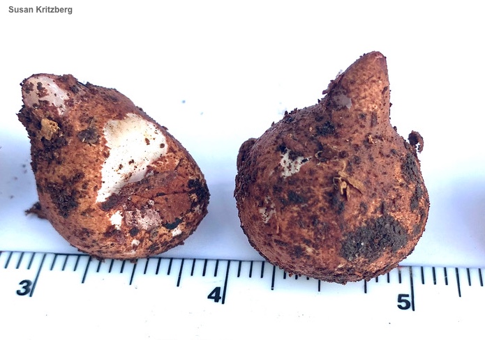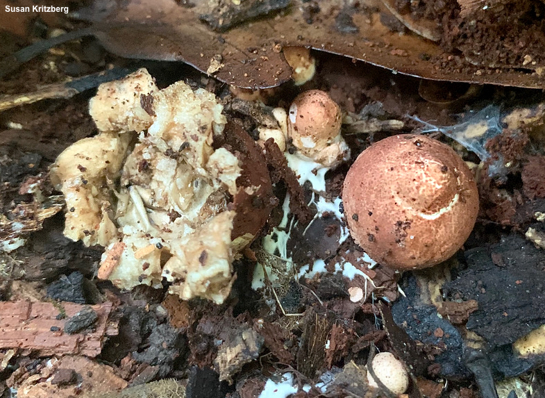 Geastrum morganii [ Basidiomycota > Geastrales > Geastraceae > Geastrum . . . ] by Michael Kuo This rare earthstar is similar in appearance to the much more common Geastrum saccatum; like that species it is fairly small and features a spore case that appears to be nested comfortably in a small bowl. However, Geastrum morganii has a prominent, irregularly grooved beak, arms that bruise slowly pinkish, and a distinctive reddish to reddish brown coating on the outer surface of young specimens. In North America Geastrum morganii is apparently limited to the Midwest—but its documentation is uneven, and it is not often described; it may have been recorded elsewhere as "Geastrum saccatum" or another species. Thanks to Susan Kritzberg for documenting, collecting, and preserving Geastrum morganii for study; her collection is deposited in The Herbarium of Michael Kuo. Description: Ecology: Saprobic; growing alone or gregariously under hardwoods; often found near rotting stumps; summer and fall; originally described from the United States (Lloyd 1901, unspecified location); in North America fairly widely distributed east of the Great Plains, especially in the Midwest; also known from Central America, South America, Europe (coastal France and Spain, where it is very rare), and Oceania. Immature Fruiting Body: An onion-shaped ball 1.5–2.5 cm wide and up to 3 cm high, with a reddish to reddish brown covering that sometimes separates in places to reveal a paler surface underneath. Mature Fruiting Body: 3–4 cm across; with 5–7 recurved, more or less triangular arms underneath a ball-shaped spore case 1.5–3 cm across; outer surface of arms with a reddish brown covering; inner (upper) surface of arms beige, bruising pink to reddish, bald but developing cracks and fissures (sometimes cracking deeply and uniformly to create a small saucer like that of Geastrum triplex); spore case more or less round, smooth or faintly felty, with a papery skin, brown to brownish, with an irregularly grooved (or at least wrinkled) conical beak; interior of spore case initially solid and white but soon powdery and dark brown; base attached to white rhizomorphs. Microscopic Features: Spores 2.5–4 µm including ornamentation of low, dense spines under 0.5 µm; long; globose; yellowish to brownish or brown in KOH. Capillitial threads 3–6 µm wide; aseptate; walls smooth or roughened, 1–2 µm thick; brownish-walled in KOH. REFERENCES: Lloyd, 1901. (Coker & Couch, 1928; Smith, 1951; Ponce de Leon, 1968; Smith, Smith & Weber, 1981; Hernández Caffot et al., 2013; Jeppson et al., 2013; de Oliveira Sousa et al., 2014; Zamora et al., 2014.) Herb. Kuo 08182101. This website contains no information about the edibility or toxicity of mushrooms. |
