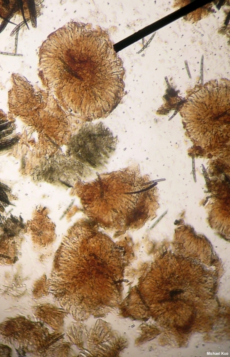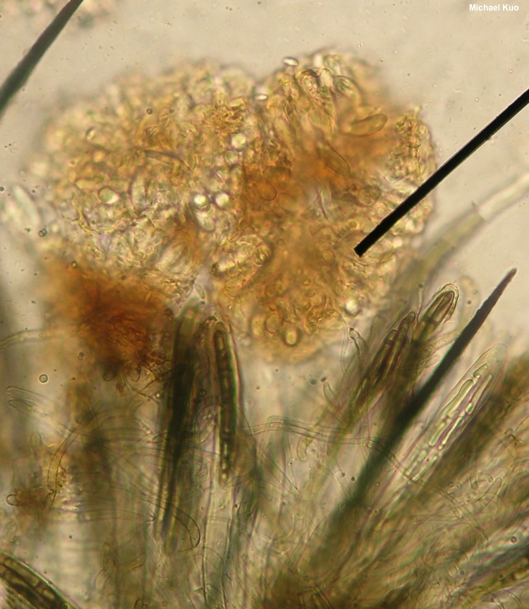 Gelatinopsis geoglossi [ Ascomycota > Helotiales > Helicogoniaceae > Gelatinopsis ... ] by Michael Kuo Here's a cup fungus that's so tiny you can't see it . . . which might reasonably make you wonder why on earth I have featured it at my website. The truth is, I didn't collect it on purpose; unbeknownst to me, it was hitching a ride on the fruiting bodies of Trichoglossum farlowii specimens Melissa and I collected in North Carolina. I suppose "hitching a ride" is a bit of a misrepresentation, though, since the little fungus is a parasite; it embeds itself in the hymenium of the Trichoglossum, essentially killing it. Hitchhikers don't generally do that, except in those "true" crime magazines my grandma used to read. Hypomyces geoglossi and Micropyxis geoglossiare former names. Description: Ecology: Parasitic on "earth tongue" mushrooms in the genera Geoglossum and Trichoglossum—especially Trichoglossum farlowii; growing densely gregariously; summer and fall; originally described from New Jersey; distribution uncertain (documented from eastern North America, the Caribbean, and France). The illustrated and described collection is from North Carolina. Fruiting Bodies: Microscopic; covering the surfaces of the host fungi; visible at lower magnifications as cushion-shaped masses, orangish brown in KOH. Microscopic Features: Spores 6–10 x 3–4 µm; subellipsoid or irregularly amygdaliform; smooth; hyaline in KOH. Asci 30–40 µm long; cylindric; hyaline in KOH. Paraphyses 2 µm wide; filiform with rounded apices. REFERENCES: (J. B. Ellis & B. M. Everhart, 1886) G. Rambold & D. Triebel, 1990. (Ellis & Everhart, 1892; Pfister, 1976; Rambold & Triebel, 1990; Quijada & Pfister, 2021.) Herb. Kuo 08101912. This site contains no information about the edibility or toxicity of mushrooms. |