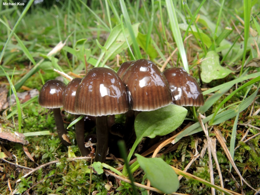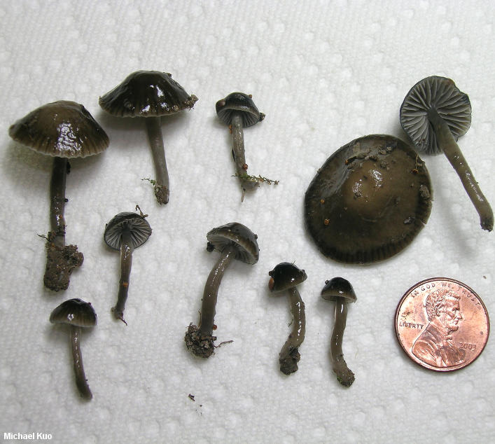 Cap: 1–4 cm across; convex at first, expanding to broadly convex, with or without a broad central bump; bald; slimy; nearly black when very young, maturing to dark grayish brown; the margin at first pale (almost bluish when fresh), becoming translucently lined with age.