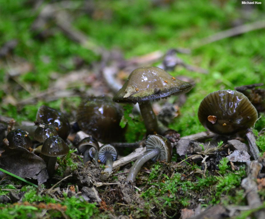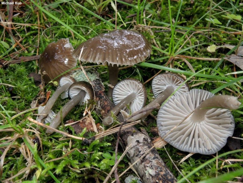 Here is an odd waxy cap, characterized by its glutinous cap and stem and its grayish brown to nearly black colors. It is closely related to Gliophorus psittacinus, the well-known, green-then-yellow "parrot mushroom," with which it shares the slimy surfaces and overall stature. But Gliophorus irrigatus is, well, drab—so drab that it is easily overlooked on the forest floor. It is apparently widely distributed in North America, but not commonly collected.