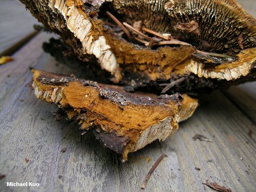 Gloeophyllum sepiarium [ Basidiomycota > Gloeophyllales > Gloeophyllaceae > Gloeophyllum . . . ] by Michael Kuo Decomposing the deadwood of conifers across North America, Gloeophyllum sepiarium is fairly easily recognized. When fresh and very young its cap is more or less orange, but as it matures brown colors replace the orange from the center outwards. The underside of this polypore features gills--which is a bit odd, since polypores have pores rather than gills! (For help sorting through this mess, see the essay on the page for Lenzites betulinus, another "gilled polypore.") Other distinguishing features include the brown flesh and the black reaction to KOH, as well as microscopic features. Description: Ecology: Saprobic on the deadwood of conifers and, occasionally, hardwoods (especially those, like quaking aspen, that grow in conifer-dominated ecosystems); causing a brown rot; growing alone or gregariously; appearing in woods, but not infrequently found on lumber in urban settings; annual or reviving to be perennial; summer and fall (and over winter in warm climates); widely distributed in North America. Cap: Single or compound (and then either fused laterally or with loosely arranged lobes arising from a central point); up to about 12 cm across and 8 cm deep; semicircular, irregularly bracket-shaped, or kidney-shaped; flattened-convex; velvety to hairy; rugged; with concentric zones of texture and color; at first yellow to orange, becoming yellow-brown to dark brown or nearly black toward the point of attachment but usually remaining yellow to orange on the growing margin. Gills: Irregular and often fusing; fairly close; often mixed with slot-like pores; edges yellow-brown becoming darker brown with age; faces creamy to pale brownish, darkening with age; up to about 1 cm deep. Stem: Absent Flesh: Dark rusty brown or dark yellow-brown; corky. Chemical Reactions: KOH black on flesh. Spore Print: White. Microscopic Features: Spores 9-13 x 3-5 µ; smooth; cylindric; inamyloid; hyaline in KOH. Basidia often elongated. Cystidia cylindric; up to about 100 x 10 µ. Hyphal system trimitic. REFERENCES: (Wulfen, 1786) Karsten, 1882. (Fries, 1821; Saccardo, 1887; Overholts, 1953; Smith, Smith & Weber, 1981; Arora, 1986; Gilbertson & Ryvarden, 1987; States, 1990; Phillips, 1991/2005; Lincoff, 1992; Metzler & Metzler, 1992; Evenson, 1997; Barron, 1999; McNeil, 2006; Miller & Miller, 2006.) Herb. Kuo 08140702; DBG RMNP 2008-087, 2008-091, 2008-096, 2008-097, 2008-098. This website contains no information about the edibility or toxicity of mushrooms. |