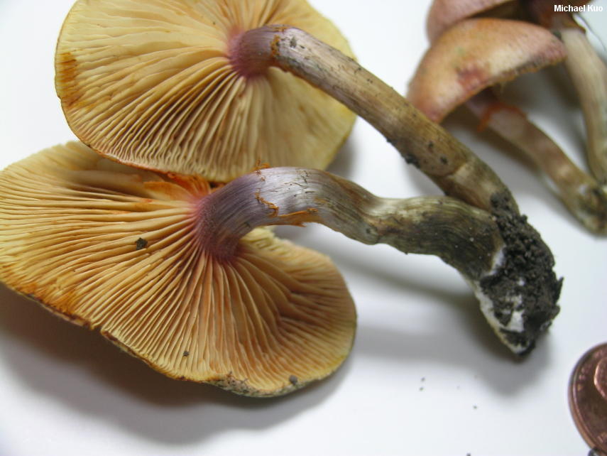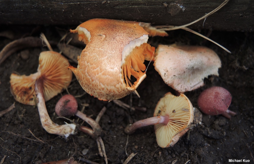 Gymnopilus luteofolius [ Basidiomycota > Agaricales > Strophariaceae > Gymnopilus . . . ] by Michael Kuo This fantastic fungus showed up in my back yard some years ago, fruiting from treated lumber (!) set down around a landscaping area. Since then it has come back every year in October. The pale yellow gills of Gymnopilus luteofolius contrast nicely with the purplish red cap, and its partial veil becomes a flimsy ring or ring zone that catches the bright orange spores as they fall from the gills. Other distinguishing features for Gymnopilus luteofolius include its bitter taste, the purplish pink sliced flesh, and microscopic features—including relatively small, finely warted spores and abundant cheilocystidia. Several times my collections have demonstrated bluish green staining on the cap and stem and, although green stains were not included in the original description of the species (Peck, 1875), subsequent collectors (e.g. Stamets, 1996) have documented the phenomenon. However, in some years my back yard Gymnopilus does not stain blue. Go figure! Thanks to Linda Goodwin (who also found this species in her yard, on top of an "8 foot high pile of mixed pine and hardwood wood chips") for collecting, documenting, and preserving Gymnopilus luteofolius for study; her collection is deposited in The Herbarium of Michael Kuo. Description: Ecology: Saprobic on the deadwood of conifers (including commercial lumber and wood chips), and occasionally reported on the wood of hardwoods; usually growing in loose clusters or densely gregariously; summer and fall, or over winter in warm climates; apparently widely distributed in North America. The illustrated and described collections are from Illinois and North Carolina. Cap: 2–6 cm; convex, becoming broadly convex, broadly bell-shaped, or nearly flat; dry; densely to sparsely covered with small, innate scales, especially over the center; purplish red to pinkish brick red when young, fading to pinkish or yellowish (or somewhat mottled with these colors); eventually becoming brownish orange or tan; sometimes stained bluish green in places; the margin not lined. Gills: Attached to the stem by a notch; close; pale to medium yellow at first, becoming deeper yellow and developing rusty brown discolorations; eventually becoming rusty overall; short-gills frequent; when very young covered by a thin partial veil. Stem: 3–6 cm long; 3–6 mm thick; more or less equal, or sometimes with a slightly swollen base; purplish pink, becoming orangish to brownish; fibrillose; with a flimsy, ephemeral ring or with a ring zone near the apex; basal mycelium white. Flesh: Whitish; turning purplish pink in the cap when sliced, or not changing. Odor and Taste: Taste strongly bitter; odor not distinctive. Chemical Reactions: KOH olive to black on cap surface. Spore Print: Bright rusty orange. Microscopic Features: Spores 5.5–8.5 x 3.5–5 µm; more or less ellipsoid; verrucose; brownish orange in KOH; dextrinoid. Basidia 4-sterigmate. Pleurocystidia not found. Cheilocystidia abundant, scattered, or absent; 20–30 x 5–7.5 µm; clavate, subcapitate, or lageniform; smooth; thin-walled; hyaline to dark brownish orange in KOH. Pileipellis a cutis; elements 5–15 µm wide, smooth or encrusted, brownish orange in KOH, with clamp connections. REFERENCES: (Peck, 1875) Singer, 1951. (Hesler, 1969; Arora, 1986; Stamets, 1996; Barron, 1999; Desjardin, Wood & Stevens, 2015; Siegel & Schwarz, 2016.) Herb. Kuo 10251403, 10201701, 08312001. This website contains no information about the edibility or toxicity of mushrooms. |