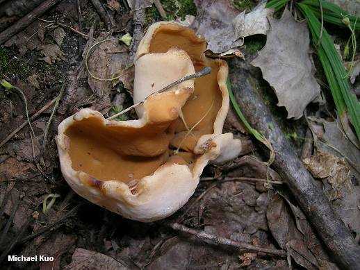 Gyromitra leucoxantha [ Ascomycetes > Pezizales > Discinaceae > Gyromitra . . . ] by Michael Kuo Despite appearances, this cup fungus is actually closely related to the false morels, and officially belongs in the genus Gyromitra. To the naked eye it is more or less indistinguishable from a host of other brownish, springtime cup fungi (including Disciotis venosa, Peziza arvernensis, and others). Under the microscope, however, it is clearly distinct from most look-likes. Field guides, which usually treat this species as "Discina leucoxantha," emphasize yellowish colors and a fairly well developed (but small) stem structure for Gyromitra leucoxantha, but I would not bet the house on any cup-like Gyromitra identification without examining spores. Mature Gyromitra leucoxantha spores have distinctive, blunt (rather than pointy) and "scooped-out" extensions at either end. Description: Ecology: Saprobic; growing alone or gregariously; terrestrial, but like many species of Gyromitra often appearing near rotted wood and stumps; found under hardwoods and conifers, in spring; northern, northeastern, and montane North America. Fruiting Body: 4-10 cm across; cup-shaped or bowl-shaped when young; flattening out with maturity, becoming irregularly saucer-shaped. Upper surface yellow to yellowish brown or orangish brown; smooth at first but usually becoming wrinkled or bumpy, at least over the center. Undersurface whitish and very finely hairy (use a lens); sometimes bruising brownish. Stem (usually present) to 5 cm long and 3 cm wide; whitish; continuous with undersurface. Flesh 2-3 mm thick; watery whitish. Microscopic Features: Mature spores 28-40 x 12-16 µ; with one or two oil droplets; smooth or roughened; with blunt, "scooped-out" apiculi at each end, extending up to 4 µ (best seen in a water mount). Asci 8-spored. Paraphyses cylindric to clavate; to 8 µ wide; with orangish to yellowish granular contents in a KOH mount. REFERENCES: (Bresàdola, 1881) Harmaja, 1969. (Saccardo, 1889; McKnight, 1969; Smith, Smith & Weber, 1981; Breitenbach & Kränzlin, 1984; Weber, 1995; Abbott & Currah, 1997.) Herb. Kuo 05259504, 05299506, 06029602, 05230503, 05090606. This website contains no information about the edibility or toxicity of mushrooms. |