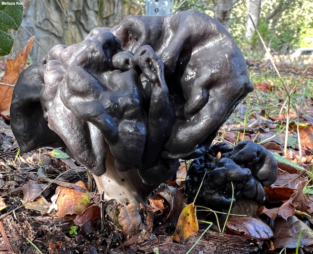 [ Ascomycota > Pezizales > Helvellaceae > Helvella . . . ] Helvella dryophila by Michael Kuo, 16 February 2024 Helvella dryophila is one of North America's many versions of Helvella lacunosa, recognized by its association with West-Coast oaks (especially coast live oak) in winter and spring. It is very similar to Helvella vespertina, which is associated with conifers and tends to appear in fall and winter, but the latter species often (not always, but often) reaches much larger proportions. Still, there is enough overlap in season and size that assessing the mycorrhizal host trees is your best bet for identification. Yes, West Coast ecosystems often contain both oaks and conifers, and yes, it can be virtually impossible to sort out probable mycorrhizal hosts. Ultimately, DNA sequencing may be the only "sure-fire" way to separate these species. Description: Ecology: Mycorrhizal with coast live oak and other oaks on the West Coast; growing alone, scattered, or gregariously; originally described from northern California (Vellinga & Nguyen 2013; the type collection was made on the the UC Berkeley campus); found from Oregon to southern California, eastward to the Sierra Nevada. The illustrated and described collections are from northern California. Cap: 1.5–4.5 cm across and 2–3.5 cm high; irregularly lobed and convoluted; black to dark gray; bald but wrinkled; the margin attached to the stem in several places; undersurface bald, gray to grayish brown. Stem: 3–5.5 cm long; 1–2.5 cm thick; more or less equal; grayish to dark gray, discoloring yellowish with age; deeply and ornately ribbed and pocketed; ribs with blunt edges; basal mycelium white. Flesh: Thin; brittle; chambered; whitish to grayish. Odor: Not distinctive. Microscopic Features: Spores 15–20 x 10–13 µm; broadly ellipsoid; smooth; with one oil large droplet; hyaline in KOH and in water. Asci 200–250 x 7.5–10 µm; 8-spored. Paraphyses 200–275 x 2.5–6 µm; filiform, with rounded to clavate, subcapitate, or irregularly swollen apices; smooth; hyaline to brown, often with granular contents. Excipular surface a palisade of clavate, hyaline to brown terminal elements 15–20 x 5–12.5 µm. REFERENCES: E. C. Vellinga & N. H. Nguyen, 2013. (Nguyen et al., 2013; Desjardin, Wood & Stevens, 2015; Landeros et al., 2015; Siegel & Schwarz, 2016; Skrede et al., 2017.) Herb. Kuo 02200310, 01191303, 01151503, 01142401. This site contains no information about the edibility or toxicity of mushrooms. |