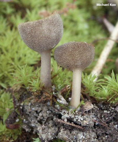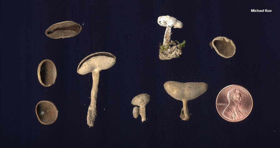 Helvella macropus [ Ascomycetes > Pezizales > Helvellaceae > Helvella . . . ] by Michael Kuo A handful of Helvella species form a cluster of hard-to-distinguish mushrooms that have cup-shaped or disc-shaped to flat caps and finely hairy, skinny stems that are not prominently ribbed. Among these species, Helvella macropus is unique in having spindle-shaped (or nearly spindle shaped) spores; the spores of look-alike species, including Helvella cupuliformis, are ellipsoid. Be careful assessing this feature, however, because the spores of Helvella macropus are often ellipsoid when immature; sometimes they seem to squeeze themselves into fusoid-ness (I'm pretty sure that's a word) only at the very end of their development. And: the entire group is in desperate need of contemporary study and revision, in my humble opinion, and we are likely to discover someday soon that our traditional notions are inaccurate. Macroscyphus macropus is a synonym. Helvella macropus var. brevis, formerly separated on the basis of its shorter stem and shorter spores, has been synonymized by Abbot & Currah (1997). Description: Ecology: Probably mycorrhizal; growing alone or gregariously on the ground or in moss under hardwoods (especially oaks) or conifers, or on rotting wood; summer and fall--or over winter in warm climates; widely distributed in North America. Cap: 1-6 cm across; cup-shaped or disc-shaped--or occasionally nearly flat; upper surface medium to dark grayish brown, bald; undersurface light to medium grayish brown, finely to prominently pustulate-hairy (especially near the margin). Flesh: Insubstantial. Stem: 1-7 cm long (but usually longer, at maturity, than the cap is wide); 1-5 mm thick; more or less equal; sometimes with clefts near the base; medium brown (usually colored like the undersurface of the cap); whitish near the base; finely hairy or nearly bald with age. Microscopic Features: Spores 18-25 x 10-12.5 µ; fusoid to subfusoid (but occasional ellipsoid spores are often present, especially when still in asci); smooth or roughened; when fresh triguttulate with one large central oil droplet and another, smaller oil droplet at each end, but when revived usually with one large oil droplet and varying smaller droplets. Paraphyses hyaline to ochraceous; apices subclavate, clavate, or subcapitate, 5-10 µ wide. Excipular surface elements hyaline to brownish; often arranged in short to long fascicles; frequently septate; terminal cells subglobose. REFERENCES: (Persoon, 1796) Karsten, 1871. (Fries, 1822; Saccardo, 1889; Smith Weber, 1972; Smith, Smith & Weber, 1981; Breitenbach & Kränzlin, 1984; Arora, 1986; Phillips, 1991/2005; Lincoff, 1992; Abbott & Currah, 1997; Barron, 1999; Roody, 2003; McNeil, 2006; Miller & Miller, 2006.) Herb. Kuo07209401, 05230302, 06010407, 07250701, 06090803. This site contains no information about the edibility or toxicity of mushrooms. |