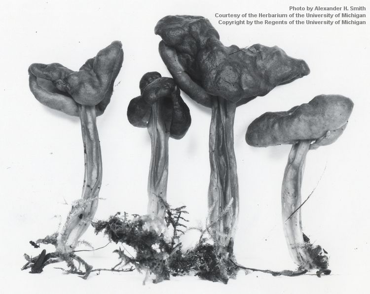 Helvella palustris [ Ascomycetes > Pezizales > Helvellaceae > Helvella . . . ] by Michael Kuo This is a small, dark species of Helvella found among mosses is swamps and bog in northern North America--especially in cold bogs of northern white cedar. It features a deeply ribbed, but not extensively pocketed, stem--and an irregularly shaped cap that looks a bit like a limp saddle. I have not collected this species, but I have studied collections made in the 1960s by Helvella expert Nancy Smith Weber. Study of these specimens, together with with analysis of the original description and illustration of the species from 1879, convince me that Helvella palustris is not merely a diminutive form of Helvella lacunosa, as some (including Dissing, 1966) have argued, but a clearly distinct morphological and ecological species. Thanks to the Herbarium of the University of Michigan for facilitating study of the collections cited below, and for permission to share the photo taken by Alexander H. Smith. Description: Ecology: Probably mycorrhizal; growing scattered or gregariously on the ground or on woody debris in bogs, swamps, and wet areas; often under northern white cedar; summer and fall; Michigan to New York. Cap: 1-4.5 cm; irregular (vaguely saddle-shaped or loosely lobed); black to gray; smooth or wrinkled; bald; undersurface smooth, black at first, becoming gray to grayish; the margin free when young, later ingrown with the stem in places. Stem: 1.5-6 cm long; to 1 cm wide; more or less equal; ribbed, but the ribs not forming holes or pockets; grayish; basal mycelium white. Microscopic Features: Spores: 16.5-19 x 10-12.5 µ; elliptical; smooth; with one large oil droplet or occasionally with two to many droplets. Paraphyses brown in KOH and water; cylindric, becoming clavate to nearly capitate with maturity; 4-15 µ wide. Excipular surface elements hyaline to brown; often arranged in bundles; frequently septate; terminal cells pyriform to clavate, up to 20 µ wide. REFERENCES: Peck, 1879. (Weber, 1972.) MICH 25022 (N. J. Smith 2379); 25025 (N. J. Smith 2390). This site contains no information about the edibility or toxicity of mushrooms. |