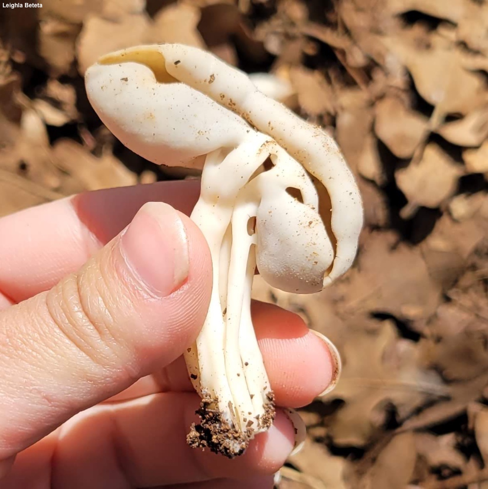 Helvella solitaria [ Ascomycota > Pezizales > Helvellaceae > Helvella . . . ] by Michael Kuo Helvella solitaria has a grayish brown to brown, cuplike cap that sits atop a whitish, deeply ribbed stem. The ribs have rounded edges and do not extend more than a few millimeters onto the undersurface of the cup, which helps to separate it from Helvella costifera and Helvella acetabulum, which have ribs that extend far onto the undersurface of the cap. Helvella solitaria grows under hardwoods or conifers, and is fairly widely distributed in North America. Several phylogenetic species have recently been separated from Helvella solitaria, including China's Helvella taiyuanensis (no morphological differences) and Europe's resurrected Helvella platypodia (putatively smaller and more gray); more are possible, especially once North American collections are studied more fully. Helvella queletii is a synonym. Thanks to Leighla Beteta for documenting, collecting, and preserving Helvella solitaria for study; her collection is deposited in The Herbarium of Michael Kuo. Description: Ecology: Probably mycorrhizal; growing alone or gregariously under hardwoods or conifers, often in the vicinity of well-rotted wood; spring through fall, or over winter in warm climates—but most often collected in late spring or early summer, in my experience. Originally described from Finland; widespread in Europe; in North America widely distributed from Alaska and the Maritime Provinces through Mexico; also recorded from Central America and Asia. The illustrated and described collections are from Colorado, Illinois, and Oklahoma. Cap: 2–5 cm across; 1.5–4 cm high; when young sometimes folded inward along a central axis, creating a saddle-bags shape; cuplike or saucer-like at maturity (but sometimes irregular in shape); upper surface grayish brown to brown or yellowish brown, smooth or slightly wrinkled, bald or, with a lens, finely fuzzy; undersurface pale grayish brown to whitish (sometimes darker near the margin), densely but finely fuzzy, at least with a lens. Stem: 12–65 mm long and 4–20 mm thick; often flaring to apex and/or base; deeply ribbed with 4–8 round-edged longitudinal ribs that terminate at the apex of the stem and do not continue onto the undersurface of the cap for more than a few millimeters; whitish or creamy yellowish. Flesh: Thin; brittle; white in the stem; whitish to brownish in the cap; unchanging when sliced. Odor: Not distinctive. Chemical Reactions: KOH negative on all surfaces. Iron salts negative on stem surface. Microscopic Features: Spores 17–22 x 10–15 µm; ellipsoid; smooth; with one large central oil droplet that often nearly completely fills the spore; hyaline in KOH or water; inamyloid. Asci 175–250 x 12.5–17.5; 8-spored; tips not bluing in Melzer's. Paraphyses exceeding the asci 10–25 µm; filiform with rounded to clavate or subclavate apices; 3–6 µm wide at apex; sparingly septate; hyaline in KOH or water. Excipular surface a turf of elements 5–15 µm wide; arranged in trichoderm-like chains; frequently septate, with occasional constrictions at septa; terminal cells clavate or irregularly swollen; hyaline in KOH or water. REFERENCES: P. A. Karsten, 1871. (Seaver, 1942 [P. platypodia]; Kempton & Wells, 1970; Smith Weber, 1972; Harmaja, 1977; Smith, Smith & Weber, 1981; Arora, 1986; Abbott & Currah, 1997; Barron, 1999; Landeros et al., 2012; Landeros et al., 2013; Beug et al., 2014; Kuo & Methven, 2014; Landeros et al., 2014; Desjardin, Wood & Stevens, 2015; Gminder & Böhning, 2017; Skrede et al., 2017; Læssøe & Petersen, 2019; Wang et al., 2019; Skrede et al., 2020.) Herb. Kuo 05099505, 06030401, 05070702, 08120708, 04211203, 05251301, 05231806, 05182101, 04172201. This site contains no information about the edibility or toxicity of mushrooms. |