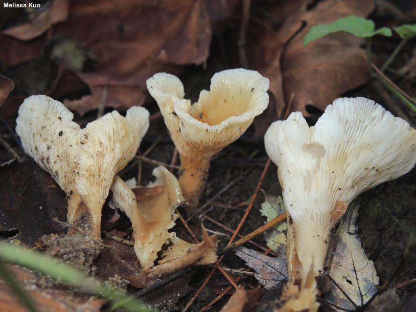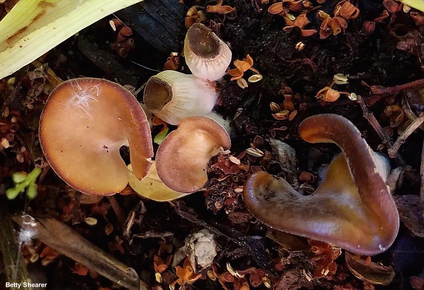 Hohenbuehelia petaloides [ Basidiomycota > Agaricales > Pleurotaceae > Hohenbuehelia ... ] by Michael Kuo Hohenbuehelia petaloides is distinctively shaped; its "petaloid" habit often makes it look like a shoehorn with gills, or a rolled-up funnel. Other identifying features include its fairly crowded whitish gills, a white spore print, mealy odor and taste—and, under the microscope, gorgeous "metuloids" (thick-walled pleurocystidia). It often appears in clusters in urban, semi-urban, or even household settings, and is frequently associated with woody debris (though it does not usually grow directly from dead wood) or cultivated soil. However, it can be found in woodland settings, too, where it tends to grow alone or in small groups. Lentinellus cochleatus can appear very similar, but it grows directly from logs and stumps, and features more conspicuously serrated gill edges; additionally, its microscopic details are very different. Hohenbuehelia geogenia is a synonym; Hohenbuehelia "petalodes" (without the i) is an alternate spelling. Thanks to Betty Shearer for collecting, documenting, and preserving Hohenbuehelia petaloides for study; her collection is deposited in The Herbarium of Michael Kuo. Description: Ecology: Saprobic; growing alone, gregariously, or in clusters; terrestrial; often in the vicinity of woody debris; often found in gardens, parks, lawns (etc.), or even potted plants—but also found in woods; summer and fall (or over winter in warmer climates); widely distributed in North America. The illustrated and described collections are from Illinois, Kentucky, and California. Cap: 3–9 cm across; usually shoehorn-shaped, or rolled into a funnel shape—but sometimes fan-shaped and lobed; sticky to moist when fresh; fairly bald, but sometimes with fine white fuzz in places; dark brown to grayish brown at first, fading to pale yellowish brown or beige, often with a darker central area; the margin not lined. Gills: Running deeply down the stem; crowded; short-gills frequent; whitish, becoming dull yellowish. Stem: Present but hard to define precisely, since it is continuous with the cap; 1–3 cm high; 3–10 mm thick; brownish to whitish; bald, or fuzzy over the lower half; basal mycelium white. Flesh: Whitish; rubbery; unchanging when sliced. Odor and Taste: Mealy. Chemical Reactions: KOH on cap surface negative. Spore Print: White. Microscopic Features: Spores 5–9 (-10) x 3–4.5 µm; ellipsoid; apiculus prominent; smooth; hyaline in KOH; inamyloid. Cheilocystidia fusoid to lecythiform, capitate, or irregular; to about 35 x 8 µm. Pleurocystidia ("metuloids") abundant; lanceolate to fusoid; 35–100 x 7.5–20 µm; with very thick walls; smooth but sometimes developing apical encrustations (sometimes hard to see in KOH mounts but visible in lactophenol and cotton blue); hyaline with ochraceous walls in KOH. Pileipellis a thin cutis-like tangle of elements 2.5–7.5 µm wide, with scattered, embedded pileocystidia above a thick zone of gelatinized hyphae. Clamp connections present. REFERENCES: (Bulliard, 1780) Schulzer, 1866. (Fries, 1821; Saccardo, 1887; Kauffman, 1918 [Pleurotus spathulatus]; Arora, 1986; Thorn & Barron, 1986; Breitenbach & Kränzlin, 1991; Lincoff, 1992; Metzler & Metzler, 1992; Roody, 2003; Kuo & Methven, 2014; Desjardin, Wood & Stevens, 2015; Siegel & Schwarz, 2016.) Herb. Kuo 05280707, 06251103, 10041510, 07061601, 07181614. This site contains no information about the edibility or toxicity of mushrooms. |