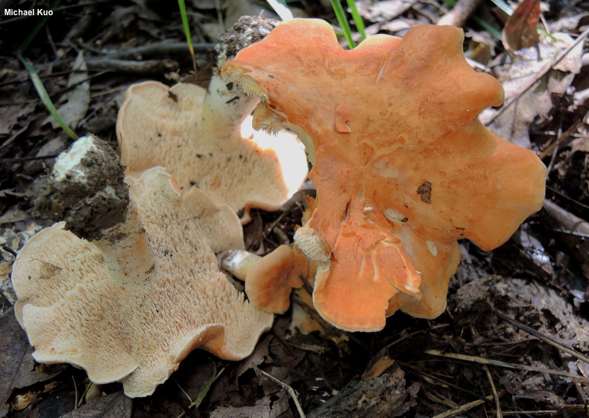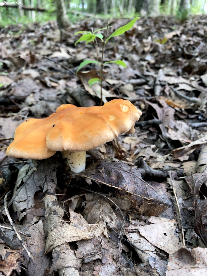Hydnum aerostatisporum [ Basidiomycota > Cantharellales > Hydnaceae > Hydnum ... ] by Michael Kuo Large and orange, with a stem that often darkens with age, Hydnum aerostatisporum is apparently common and widely distributed east of the Rocky Mountains in hardwood or mixed forests. It was originally described from Texas, but has since been documented in the Midwest, the southeastern United States, and Québec. It is one of several similar eastern North American species that are apparently less common and have more limited distribution (see Swenie and collaborators 2018). Under the microscope, Hydnum aerostatisporum has fat spores with tiny apiculi, leading to the Latin species name, since the authors of the species (Buyck and collaborators 2017) thought the spores looked like hot air balloons (aerostati-sporum = airship-spore). Hydnum subrufescens is a synonym, representing European semicolonialist taxonomy based on touristic collections made by Europeans visiting North America—who then neglected to study other, previous European semicolonialist taxonomy based on touristic collections made by Europeans visiting North America. I don't know if you can tell this, but I'm kinda sick of European mycologists trying to establish and describe North American species based on a few collections made on their vacations. (That said, I should add that many North American mycologists do basically the same thing to Central America, South America, and Africa . . . maybe I need to write an essay called "Mycocolonialism," and start with Linnaeus.) Description: Ecology: Mycorrhizal, probably with oaks and other hardwoods; recorded in various ecosystems, including hardwood and mixed hardwood-conifer forests; growing gregariously on the ground; summer and fall; widely distributed east of the Rocky Mountains. The illustrated and described collections are from Illinois. Cap: 3.5–13 cm wide; broadly convex, becoming planoconvex, flat, or shallowly centrally depressed; dry; bald, but often becoming cracked and subscaly with age; pastel orange when young, becoming orange to brownish orange; the margin becoming wavy and broadly lobed with age. Undersurface: Not running down the stem, or just beginning to do so; covered with densely packed, soft spines that are round in cross-section and measure 2–6 mm long; creamy to pale orangish; not bruising. Stem: 3–8 cm long; 2–3 cm thick; equal; dry; bald; pale orangish when young, but often becoming darker brownish orange with maturity; bruising brownish orange; sometimes with a whitish sheen or whitish patches in places. Flesh: Whitish; sometimes slowly orangish or brownish when sliced; brittle. Odor and Taste: Sweetish, not distinctive. Chemical Reactions: Ammonia flashing pink, then resolving to negative on cap surface. KOH negative on cap surface. Iron salts negative on cap, spines, and stem. Microscopic Features: Spores 6–8.5 x 6–7 µm; subglobose to broadly ellipsoid, with a small apiculus; smooth; hyaline in KOH. Basidia 4-sterigmate; 30–40 x 4–6 µm; subclavate. Pseudocystidia 30–36 x 2–7 µm; cylindric with rounded apices, or occasionally sublageniform; thin-walled; smooth; hyaline or with golden contents in KOH. Pileipellis not clearly differentiated; cap surface hyphae tangled, 3–8 µm wide, hyaline to ochraceous in KOH, with clamp connections. REFERENCES: B. Buyck, D. Lewis & V. Hofstetter, 2017. (Buyck et al., 2017; Niskanen et al., 2018; Swenie et al., 2018.) Herb. Kuo 09289621, 09181403, 08032004. This site contains no information about the edibility or toxicity of mushrooms. |
