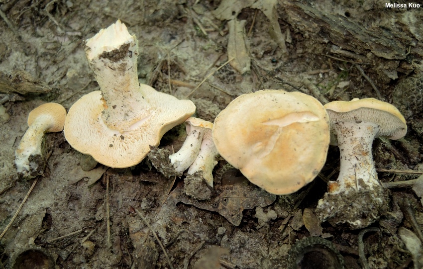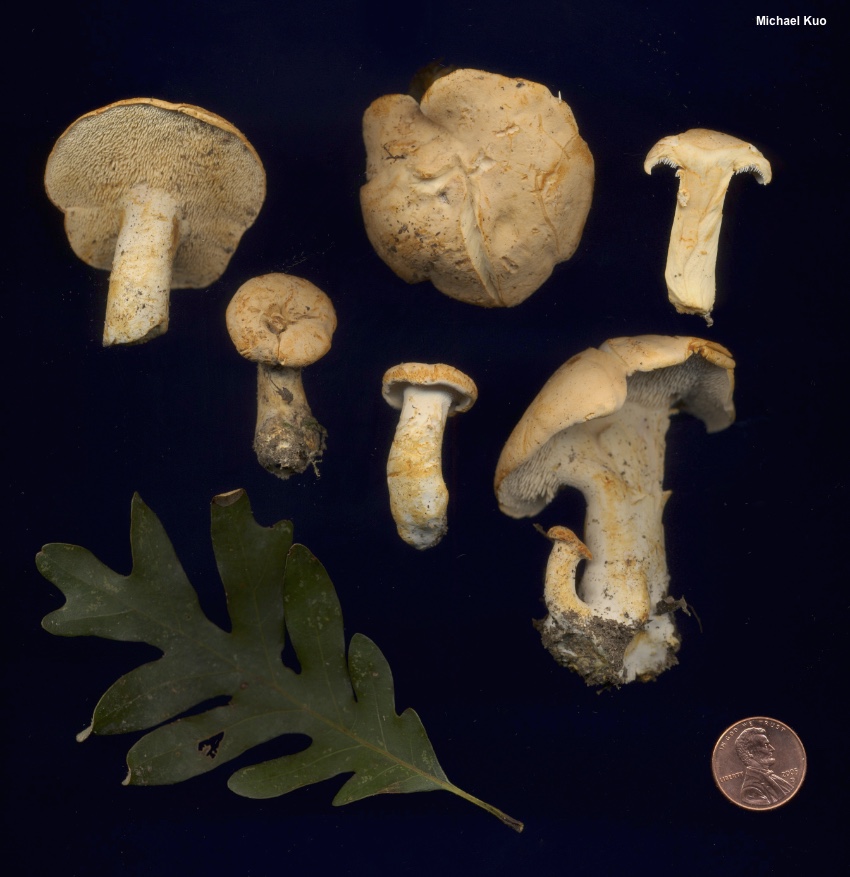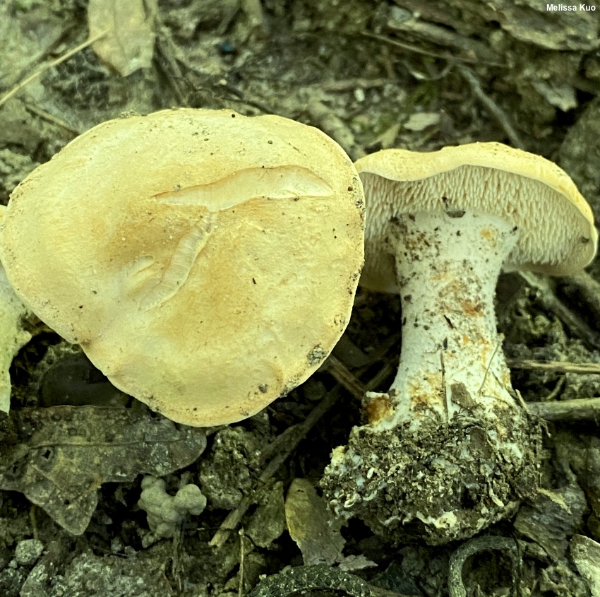 Hydnum subtilior [ Basidiomycota > Cantharellales > Hydnaceae > Hydnum ... ] by Michael Kuo Apparently common in eastern North America from roughly Interstate 70 southward, Hydnum subtilior is a smallish to medium-sized species with pale orange colors and a stem that is usually a bit longer than the width of the cap. It is associated with hardwoods in a variety of forest types. Under the microscope, Hydnum subtilior features broadly ellipsoid spores about 8 µm long. Hydnum subtilior is one of several recently-named North American species, most of which have been hanging out, away from the DNA-study rain, under the "Hydnum repandum" umbrella in North American treatments. However, the true Hydnum repandum is limited to Europe, it turns out. Similar pale orange North American species include Hydnum subolympicum, generally larger, associated with hardwoods east of the Rockies—and Hydnum washingtonianum, associated with conifers, known from Newfoundland and Labrador, Washington, and California. Description: Ecology: Mycorrhizal with hardwoods; growing scattered or gregariously on the ground; summer and fall; distributed east of the Mississippi River from Illinois to the Carolinas, southward to Florida and Mexico. The illustrated and described collections are from Illinois. Cap: 2–6 cm wide; broadly convex, becoming planoconvex; dry; soft and kid-leathery to the touch; becoming finely pocked; pale dull orange to nearly whitish. Undersurface: Not running down the stem, or just beginning to do so; covered with densely packed, soft spines that are round in cross-section and measure 2–4 mm long; whitish creamy; not bruising. Stem: 3–6 cm long; 1–2 cm thick; dry; bald; whitish; discoloring and staining pale yellow-orangish, then brownish orange. Flesh: Whitish; slowly orangish to brownish orange when sliced; somewhat brittle. Odor and Taste: Sweetish, not distinctive. Chemical Reactions: KOH yellowish on cap surface. Iron salts negative on flesh, spines, and cap surface. Microscopic Features: Spores 6–9 x 5–6.5 µm; broadly ellipsoid, with an apiculus; smooth; hyaline in KOH. Basidia 2- and 4-sterigmate; 26–30 x 6–7 µm; subclavate. Pseudocystidia 28–40 x 2–5 µm; mostly cylindric with rounded apices, but occasionally fusiform or sublageniform; thin-walled; smooth; hyaline in KOH. Pileipellis not clearly differentiated; cap surface hyphae tangled, 2–4 µm wide, ochraceous to golden in KOH, with clamp connections. REFERENCES: Swenie & Matheny, 2018. (Swenie et al., 2018.) Herb. Kuo 08080904 (paratype), 08162001. This site contains no information about the edibility or toxicity of mushrooms. |