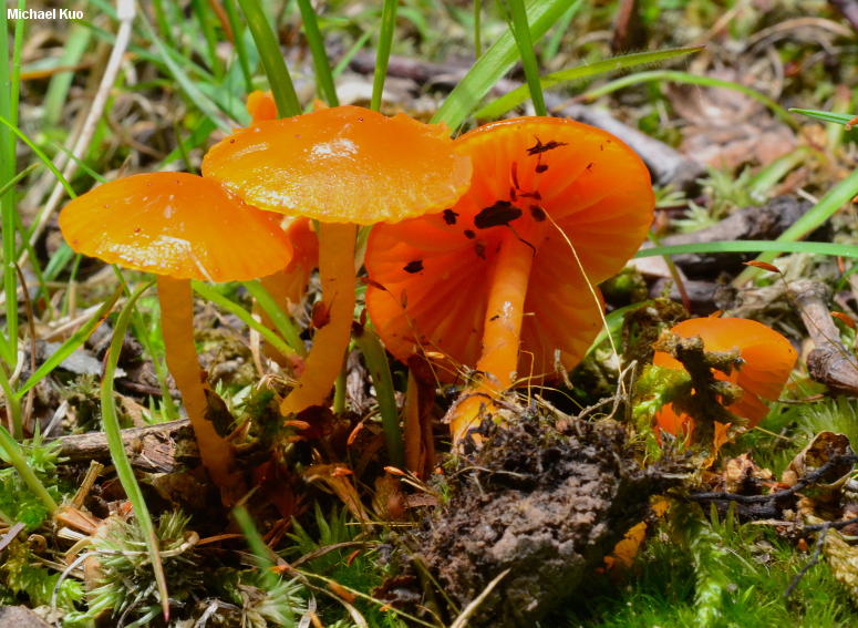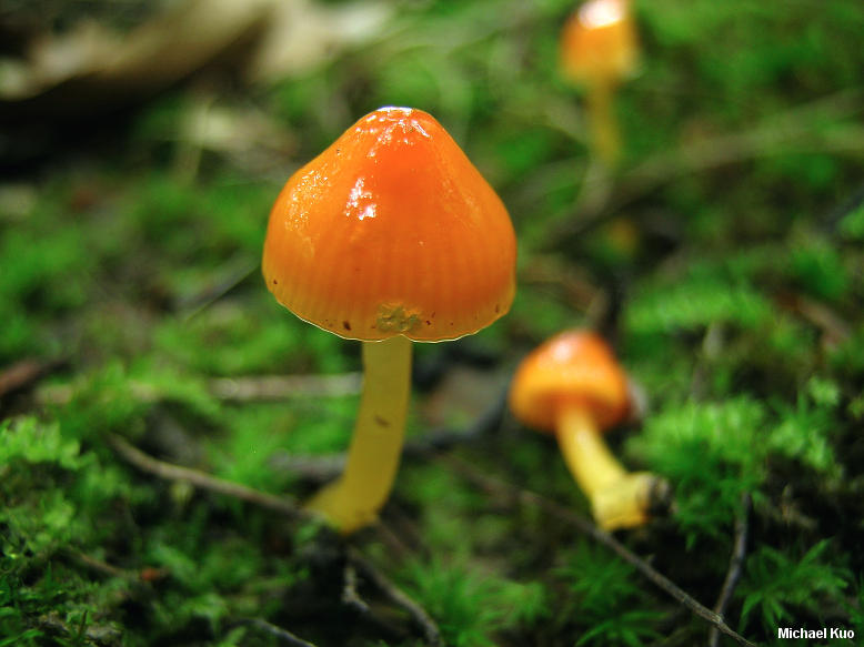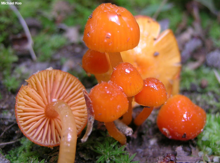 Hygrocybe glutinipes [ Basidiomycota > Agaricales > Hygrophoraceae > Hygrocybe . . . ] by Michael Kuo This bright little waxy cap commonly appears in late spring in the oak-hickory forests of central Illinois, usually in moss beds but occasionally on bare soil. It is bright orange, and slimy from head to toe. It is a good match for the European species Hygrocybe glutinipes, but seems to differ in its persistently and consistently bright orange colors, and in its vernal appearance; the European species is orange or, more commonly, yellow, and appears in summer and fall. A red version of the species, Hygrocybe glutinipes var. ruber, is also common in Europe--and it has been recorded in North Carolina by Hygrocybe expert Jean Lodge. Thanks to Ron Petersen and the University of Tennessee Fungal Herbarium for facilitating study of collection documents and photos of Hygrocybe glutinipes var. rubra. Description: Ecology: Precise ecological role uncertain (see Lodge and collaborators, 2013); appearing in woods, often on mossy ridgetops; growing scattered or gregariously; spring; North American distribution uncertain. The illustrated and described collections are from Illinois. Cap: 5-30 mm across; convex, bell shaped, or nearly hemispheric, becoming broadly convex, broadly bell shaped, or nearly flat; slimy; bald; bright orange to bright reddish orange, fading to paler orange; the margin sometimes faintly lined. Gills: Narrowly to broadly attached to the stem; close or nearly distant; orange or pale pastel orange; short-gills frequent. Stem: 20-40 mm long; 2-6 mm thick; equal; slimy; bald; colored like the cap, or paler. Flesh: Colored like the cap, or paler; thin. Odor and Taste: Not distinctive. Chemical Reactions: KOH on cap erasing orange pigment. Spore Print: White. Microscopic Features: Spores 6-9 x 3.5-5 µ; smooth; ellipsoid; hyaline and uniguttulate in KOH; inamyloid. Basidia to 45 µ long; 4-sterigmate. Hymenial cystidia absent. Gill tissue parallel. Pileipellis an ixotrichoderm of elements 2-4 µ wide. REFERENCES: (J. E. Lange, 1940) R. Haller of Aarau, 1956. (Arnolds, 1990; Boertmann, 2000.) Herb. Kuo 05200401, 05260401, 05170703, 06041302. This website contains no information about the edibility or toxicity of mushrooms. |