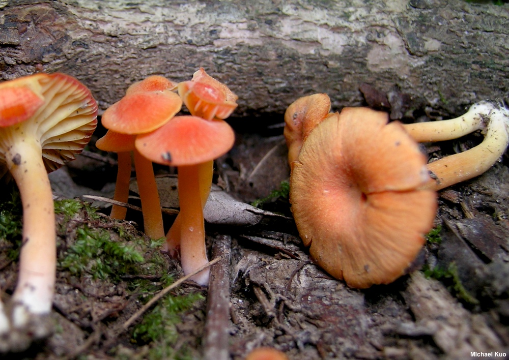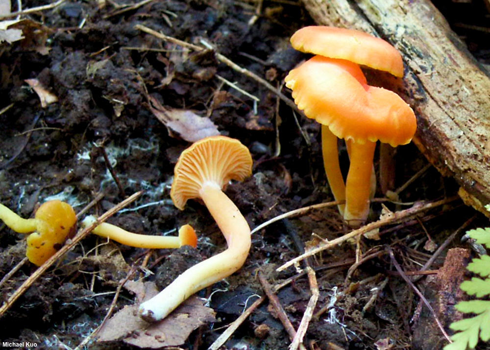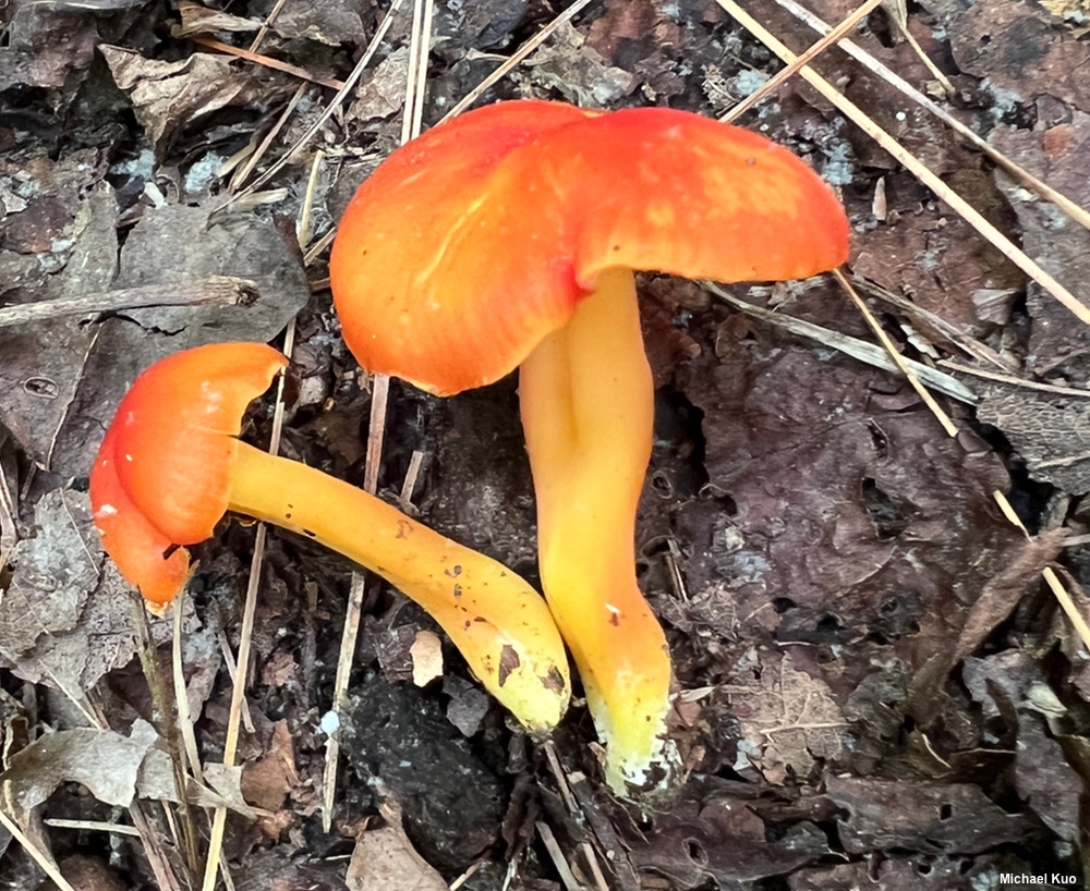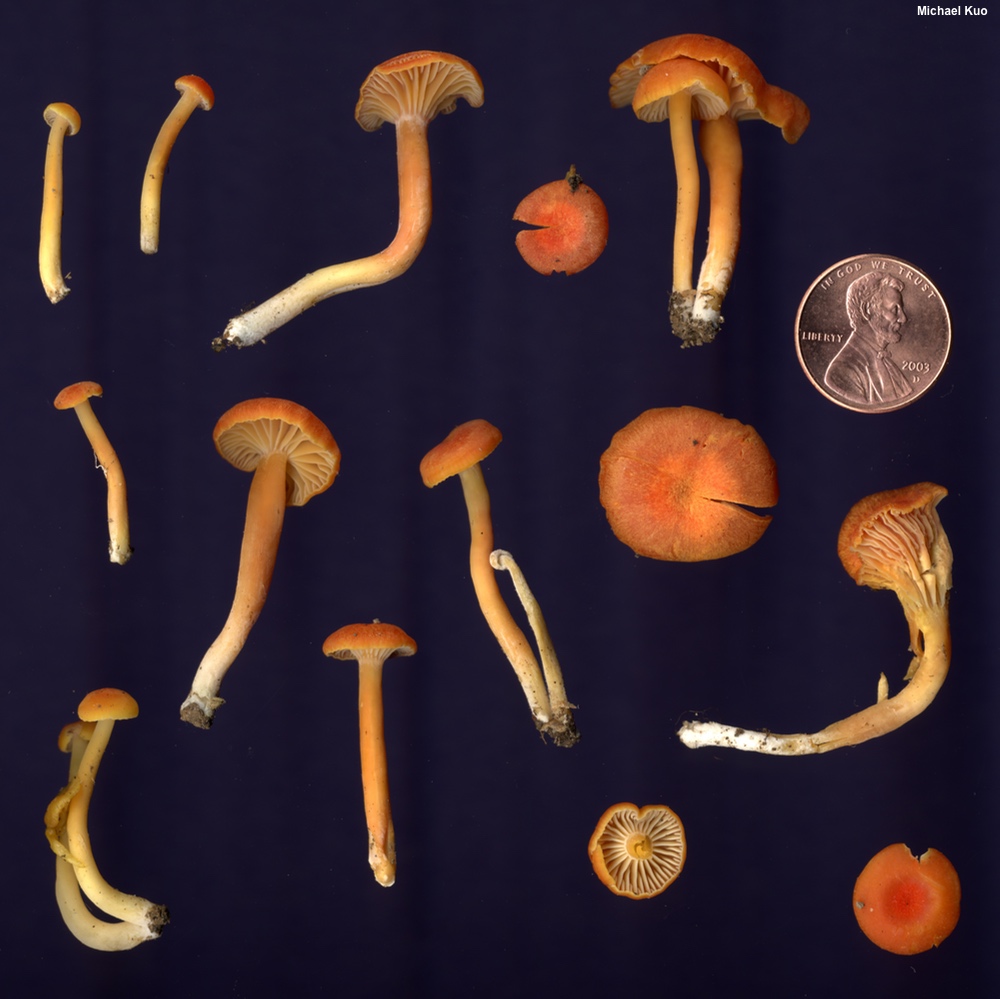 [ Basidiomycota > Agaricales > Hygrophoraceae > Hygrocybe . . . ] Hygrocybe miniata by Michael Kuo, 22 October 2024 If you enjoy spending long hours trying to identify mushrooms, I highly recommend you pick some little orange or red waxy caps, bring them home, and try to figure out what they are. Hygrocybe miniata is not Latin for "many look-alikes," but it ought to be. The mushroom's defining features include its dry, rather than sticky, cap and stem, its gills (which are attached to the stem or begin to run slightly down it, but do not really run down it), and microscopic features. Be sure to compare Hygrocybe miniata with Hygrocybe cantharellus and Hygrocybe squamulosa, both of which are very similar. Hygrophorus miniatus is a synonym. Hygrocybe miniata mollis is a variety accepted by some mycologists to represent collections that are orange or orange-yellow throughout development. Description: Ecology: Precise ecological role uncertain (see Lodge and collaborators, 2013); in Europe appearing in grassy areas but in North America usually appearing in woods under hardwoods, especially oaks; usually growing gregariously; early summer through fall; originally described from Sweden and Denmark (Fries 1821); widespread in Europe and North America; also found in Central America and Oceania. The illustrated and described collections are from Illinois, Indiana, and Ohio. Cap: 5–40 mm across; convex, becoming broadly convex or nearly flat; often developing a broad central depression; dry or slightly moist in humid or wet weather; finely radially scurfy or fibrillose, especially with age; scarlet to reddish orange when young and fresh, fading to orange or yellow; the margin sometimes becoming thinly lined and/or scalloped. Gills: Broadly attached to the stem or beginning to run down it; nearly distant; thick; pale yellow at first, becoming yellow to orange; short-gills frequent. Stem: 20–60 mm long; 2–6 mm thick; equal, or tapering to base; dry; bald; yellow near the apex; elsewhere colored more or less like the cap but fading more slowly; base white. Flesh: Orange to pale yellow; thin. Odor and Taste: Not distinctive. Chemical Reactions: KOH negative on cap surface. Spore Print: White. Microscopic Features: Spores 5–9 x 3–4.5 µm; ellipsoid or somewhat constricted and subpyriform; smooth; hyaline in KOH; inamyloid. Basidia 35–45 µm; long; 4-sterigmate. True hymenial cystidia absent, but filamentous pseudocystidia sometimes present on lamellar edge. Lamellar trama parallel. Pileipellis a cutis or trichoderm of hyaline, clamped elements 5–15 µm wide, often constricted at septa; terminal cells primarily clavate. REFERENCES: (E. M. Fries, 1838) P. Kummer, 1871. (Kauffman, 1918; Hesler & Smith, 1963; Bird & Grund, 1979; Smith, Smith & Weber, 1979; Phillips, 1981; Largent, 1985; Arora, 1986; Arnolds, 1990; Breitenbach & Kränzlin, 1991; Phillips, 1991/2005; Schalkwijk-Barendsen, 1991; Lincoff, 1992; Metzler & Metzler, 1992; Arnolds, 1995; Canduso, 1997; Barron, 1999; Boertmann, 2000; Nonis, 2001; McNeil, 2006; Miller & Miller, 2006; Boccardo et al., 2008; Trudell & Ammirati, 2009; Boertmann, 2010; Bessette et al., 2012; Buczacki et al., 2012; Lodge et al., 2013; Kuo & Methven, 2014; Desjardin, Wood & Stevens, 2015; Siegel & schwarz, 2016; Baroni, 2017; Gminder & Böhning, 2017; Wood & Dunkelman, 2017; Boertmann, 2018; Sturgeon, 2018; Læssøe & Petersen, 2019; Kibby, 2020; MacKinnon & Luther, 2021; McKnight et al., 2021.) Herb. Kuo 07140302, 07240402, 05250802, 09011601, 05252402. This website contains no information about the edibility or toxicity of mushrooms. |