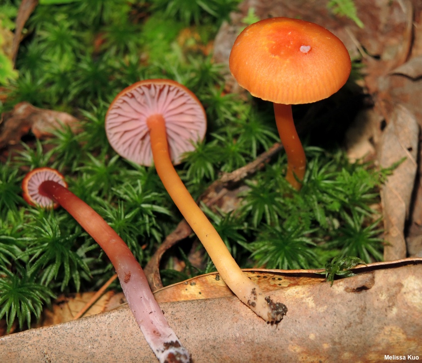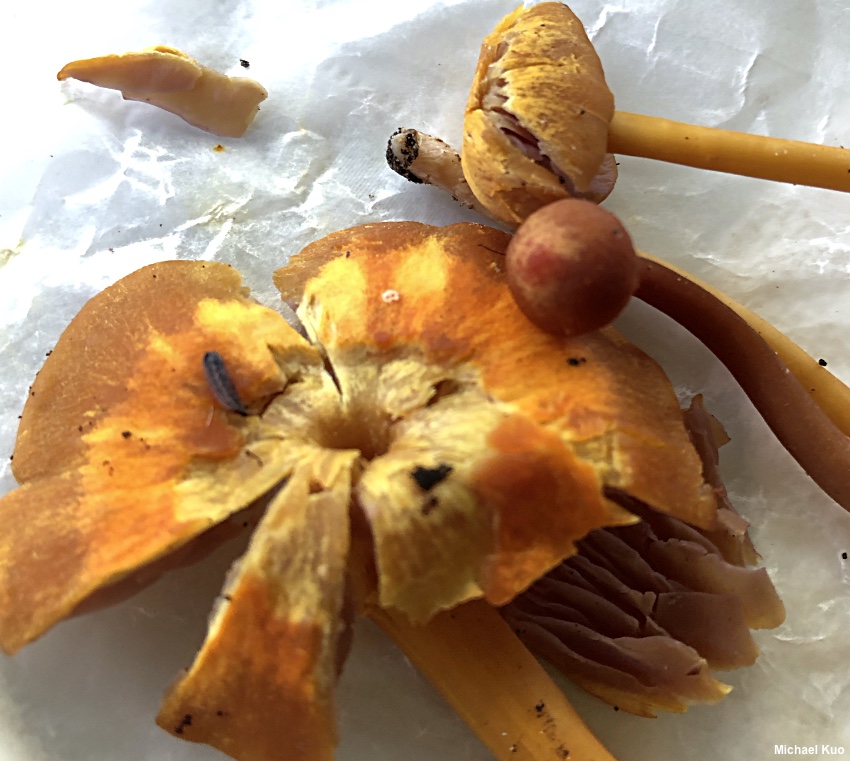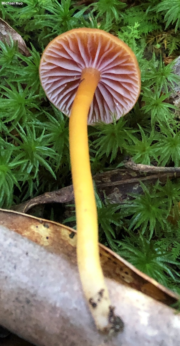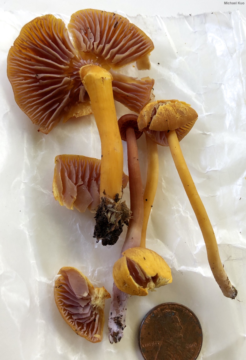 Hygrocybe purpureofolia [ Basidiomycota > Agaricales > Hygrophoraceae > Hygrocybe . . . ] by Michael Kuo Orange and red waxy caps are not the easiest mushrooms to identify, but this one stands out from the crowd once you turn it over: its gills are a dusky shade of purple. Found in the Appalachian Mountains, Hygrocybe purpureofolia starts out reddish orange, then fades and dries out rather dramatically from the center outwards, turning first bright orange, then a wishy-washy brownish yellow. The stem is orange to yellow, hollow, and features white or purplish basal mycelium. Hygrocybe mephitica is a similar species with dull purple gills, first described by Peck (1906) from Massachusetts; it grows in sphagnum bogs and features a "yellowish-brown" cap that is "sometimes tinged with green," along with a strong, unpleasant odor. Peck appears to have described the species based on a collection made by someone else ("S. Davis"), some days after the collection was made—which makes me wonder about the possibility that it is the same thing as Hygrocybe purpureofolia (in which case Peck's name is older and would have priority). Peck's "yellowish brown" is a plausible match for the past-fresh color of Hygrocybe purpureofolia, although I don't know what to do with "tinged with green" other than attribute it to algae or mold. My collection of Hygrocybe purpureofolia was made in sphagnum, and while it did not have a distinctive odor when fresh, it filled my lab with an unpleasant stink when I rehydrated a cap section for study. Hygrophorus purpureofolius is a synonym. Thanks to Sherwood Forest Friends for facilitating collection of specimens. Description: Ecology: Precise ecological role uncertain (see Lodge and collaborators, 2013); appearing in forests, often with eastern hemlock present; growing gregariously; summer and fall; Appalachian Mountains. The illustrated and described collection is from North Carolina. Cap: 2–5 cm across; convex, expanding to broadly convex or nearly flat; dry, or a little moist when fresh; bald; reddish orange to orange when fresh, fading markedly from the center to the margin as it dries out, becoming first bright orange, then brownish yellow to dull yellowish brown; thin and fragile. Gills: Broadly attached to the stem; nearly distant; short-gills frequent; dull purple. Stem: 4–7 cm long; 3–7 mm thick; more or less equal; dry; bald; orange, fading to yellow; hollow; basal mycelium white or slightly purplish. Flesh: Yellowish; not changing on exposure. Odor: Not distinctive when fresh, but rehydrated herbarium material has a strongly unpleasant odor. Chemical Reactions: KOH on cap surface negative. Spore Print: White. Microscopic Features: Spores 7–9 x 4–4.5 µm; ellipsoid or occasionally a little constricted; smooth; hyaline in KOH; inamyloid. Basidia 4-sterigmate; 35–50 µm long. Hymenial cystidia not found. Lamellar trama parallel. Pileipellis an ixotrichoderm; elements 2.5–7.5 µm wide, smooth, hyaline in KOH. REFERENCES: (Bigelow, 1960) Courtecuisse, 1989. (Hesler & Smith, 1963; Phillips, 1991/2005; Bessette et al., 2012; Lodge et al., 2013; Sturgeon, 2018.) Herb. Kuo 08091903. This website contains no information about the edibility or toxicity of mushrooms. |