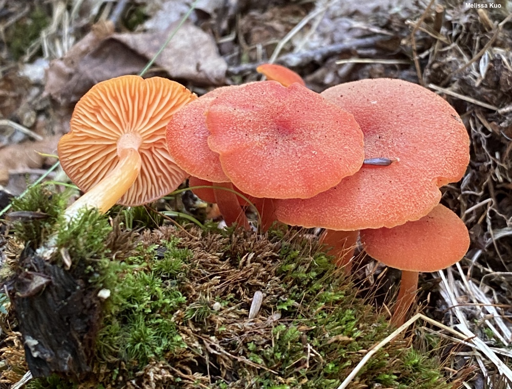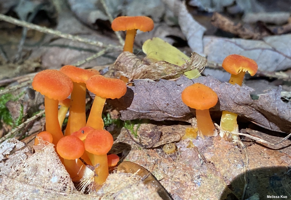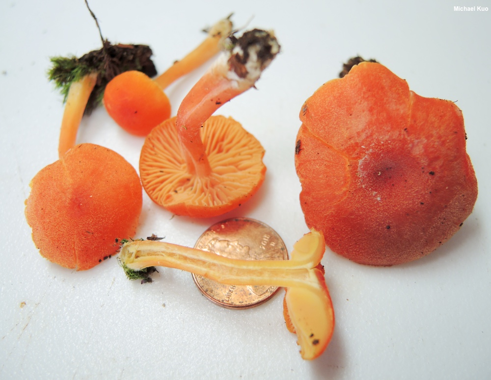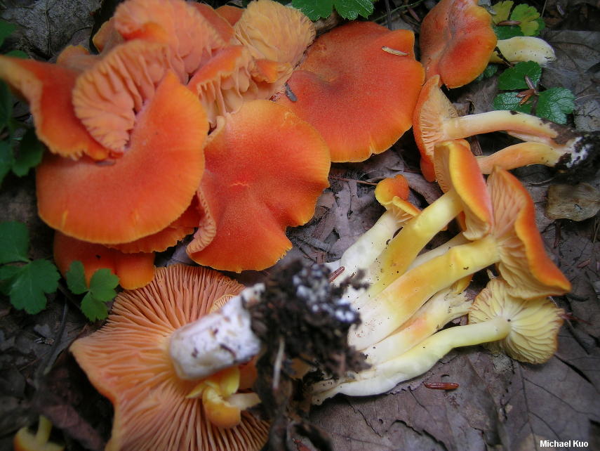 Hygrocybe squamulosa [ Basidiomycota > Agaricales > Hygrophoraceae > Hygrocybe . . . ] by Michael Kuo As species of Hygrocybe go, Hygrocybe squamulosa is pretty robust, with a cap that regularly gets 6 cm wide. Otherwise, it looks a lot like any number of red and orange waxy caps, unless you're willing to spend some quality time getting into the fine points of waxy cap identification: Hygrocybe squamulosa has a dry cap and a dry stem, gills that are broadly attached to the stem but do not run down it, and a finely scaly cap surface. Similar waxy caps include Hygrocybe miniata, which is smaller, and Hygrocybe cantharellus, which is smaller and features gills that run down the stem. Description: Ecology: Precise ecological role uncertain (see Lodge and collaborators, 2013); appearing in woods under hardwoods or conifers, often in the vicinity of, or fruiting from, well-rotted, moss-covered stumps; growing gregariously or in loose troops; summer and fall; originally described from New Jersey; distributed in North America from roughly the Great Lakes to the east and north. The illustrated and described collections are from Michigan. Cap: 25–65 mm across; convex, becoming broadly convex, nearly flat, or shallowly depressed; dry or slightly tacky; innately, finely fibrillose at first, becoming minutely scaly; reddish orange to orange when young and fresh, fading to pale orange. Gills: Broadly attached to the stem; distant or nearly so; thick; pale yellow at first, becoming orange; short-gills frequent. Stem: 30–60 mm long; 4–10 mm thick; equal; dry; bald; pale orange to yellow, with a white base. Flesh: Yellowish. Odor and Taste: Not distinctive. Chemical Reactions: KOH negative on cap surface. Spore Print: White. Microscopic Features: Spores 5–8 x 3–4.5 µm; smooth; ellipsoid or slightly oblong, but only occasionally constricted; hyaline in KOH; inamyloid. Basidia 35–45 x 5–6 µm; 4-sterigmate. True hymenial cystidia absent, but filamentous pseudocystidia sometimes present on lamellar edge. Lamellar trama parallel. Pileipellis a collapsing trichoderm of hyaline, clamped elements 5–12.5 µm wide; terminal elements cylindric, with clavate, irregular, or subacute apices. REFERENCES: (Ellis & Everhart, 1894) Arnolds, 1995. (Saccardo, 1895; Hesler and Smith, 1963; Phillips, 1991/2005; Arnolds, 1995; McNeil, 2006; Bessette et al., 2012; Lodge et al., 2013.) Herb. Kuo 09120506, 08112010. This website contains no information about the edibility or toxicity of mushrooms. |