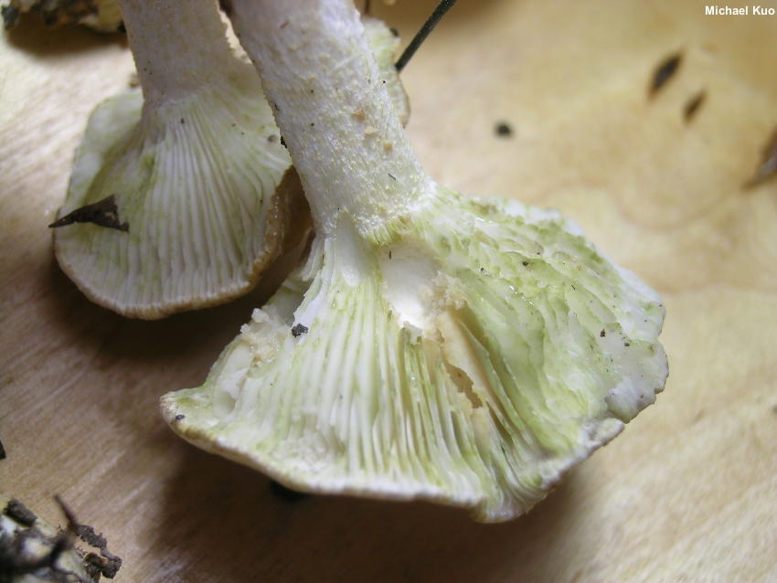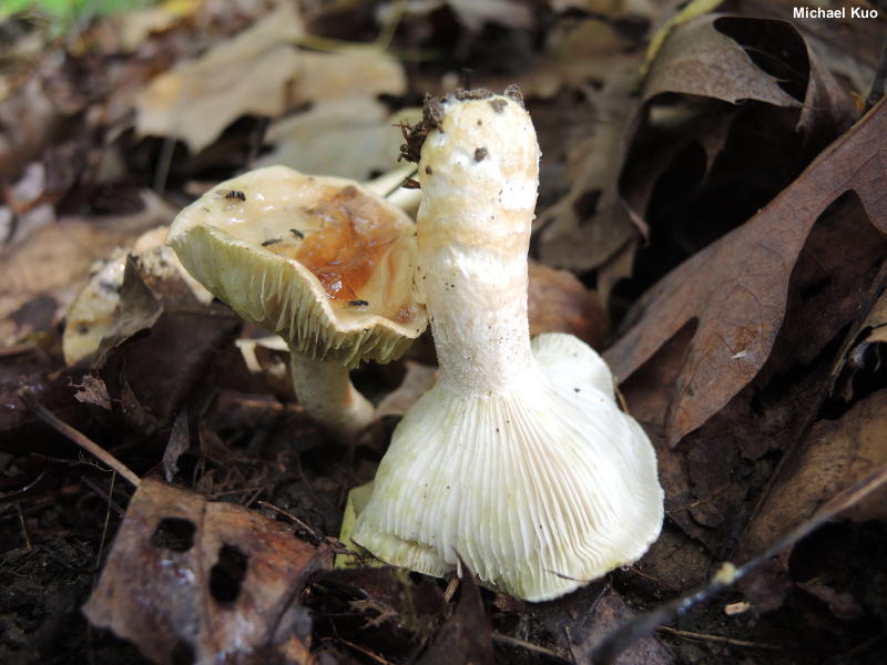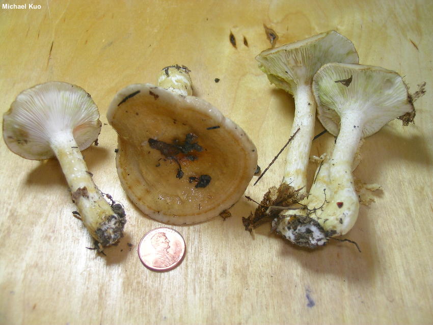 Hygrophorus paludosus [ Basidiomycota > Agaricales > Hygrophoraceae > Hygrophorus . . . ] by Michael Kuo Hygrophorus paludosus is a fairly distinctive waxy cap found under oaks and other hardwoods in the Midwest and eastern North America. I say "fairly" distinctive because it does not always exhibit its most distinguishing feature: the tendency of the gills to stain green as the mushroom matures. Without the green staining, Hygrophorus paludosus can look more or less like a host of whitish to orange, slimy species of Hygrophorus. However, close inspection reveals a few details that, when taken together, eliminate most identification contenders: the cap is whitish to pale orangish, but is usually covered with brownish orange gluten, making it appear more highly colored than it is underneath; the gills, by maturity, run down the stem; the stem features not only a sheath of the same orangish gluten found on the cap, but also a white, fibrillose sheath underneath the gluten; and the odor is not distinctive. Hygrophorus glutinosus is somewhat similar, and is often the name used for misidentified collections of Hygrophorus paludosus in which the green staining was absent, but its cap gluten is much more pale and whitish, its mature gills do not run down the stem (or do so only slightly), and it lacks the fibrillose sheath under the gluten on the stem. Microscopically the two species are indistinguishable. Description: Ecology: Mycorrhizal with oaks and other hardwoods; growing scattered to gregariously; late summer and fall (or over winter along the Gulf Coast); widely distributed in the Midwest and eastern North America. The illustrated and described collection is from Illinois. Cap: 3–6.5 cm; convex when young, becoming broadly convex or nearly flat; glutinous when fresh; bald; whitish to pale orangish, but the gluten is brownish orange (Hex D0A475) and often covers the entire cap surface; sometimes appearing zoned and/or wrinkled as the gluten dries out. Gills: Broadly attached to the stem or beginning to run down it at first, but by maturity running more deeply down the stem; close; short-gills frequent; white; usually developing yellowish green spots and discolorations with age. Stem: 5–7 cm long; 1–1.5 cm thick; nearly club-shaped at first, becoming more or less equal; dry and white near the apex, with tiny concolorous dots; sheathed for the bottom two-thirds with a copious veil of brownish orange gluten and, underneath the gluten, a white, fibrillose veil; the gluten drying and stretching out into chevron-like patterns and lines; basal mycelium white. Flesh: White; unchanging when sliced. Odor and Taste: Not distinctive. Chemical Reactions: KOH negative on cap surface; instantly dark orange on stem apex. Spore Print: White. Microscopic Features: Spores 8–11 x 4.5–6 µm; ellipsoid; smooth; hyaline, with minutely granular contents in KOH; inamyloid. Hymenial cystidia absent. Basidia 4-sterigmate. Lamellar trama divergent. Pileipellis an ixotrichoderm. REFERENCES: Peck, 1902. (Kauffman, 1918; Hesler & Smith, 1963; Smith, Smith & Weber, 1979.) Herb. Kuo 09301501. This site contains no information about the edibility or toxicity of mushrooms. |