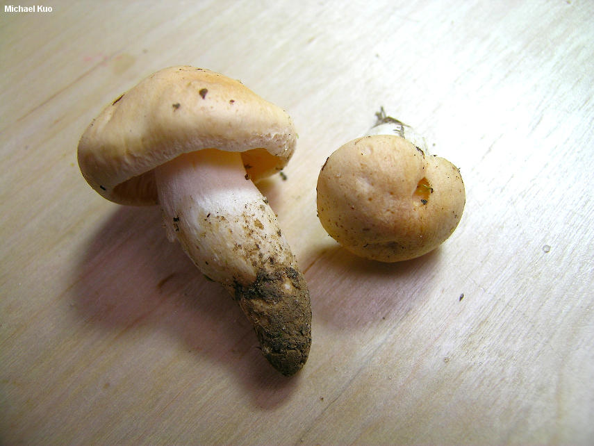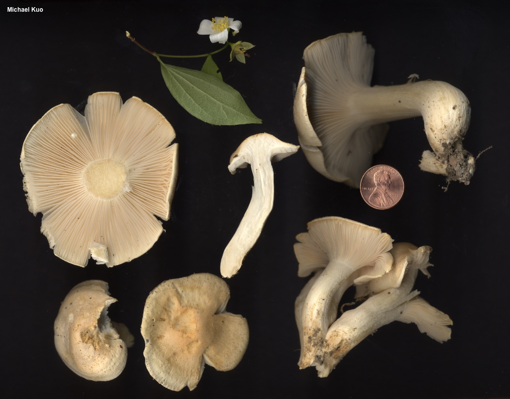 Hygrophorus poetarum [ Basidiomycota > Agaricales > Hygrophoraceae > Hygrophorus . . . ] by Michael Kuo Hygrophorus poetarum is an interesting waxy cap in the Hygrophorus pudorinus species group. Like other species in the group, it features pale pinkish orange colors, a yellow reaction to KOH, and a mealy stem apex. However, it can be separated on the basis of its association with hardwoods (especially beech), its strong, sickly sweet odor, and its small spores. In my area (central Illinois) it is quite common in late spring and early summer, and is one of the first mycorrhizal species to appear. Whether or not the North American version of Hygrophorus poetarum is phylogenetically the same as the original, European species, will depend on an extensive, DNA-based study of this species group. I suspect that many many "Hygrophorus pudorinus" collections in North American herbaria for which ecological data is lacking or insufficient ("on the ground in mixed woods," etc.) may have been made under hardwoods and have never-examined small spores, making them better matches for Hygrophorus poetarum; in a casual search of online herbarium records I find several good candidates, based on the vernal appearance and the hardwood habitat. Description: Ecology: Mycorrhizal with beech, oaks, and other hardwoods; growing alone, scattered or gregariously, often in moss; usually appearing in late spring or early summer, but occasionally found in late summer or fall; originally described from France and Switzerland; fairly widespread in Europe; North American distribution uncertain. The illustrated and described collections are from Illinois and Indiana. Cap: 2.5–8 cm; convex when young, becoming broadly convex or nearly flat; sticky when fresh, but usually drying out very quickly; bald, or finely hairy over the center; smooth, but with maturity often developing small pock marks; the margin at first inrolled, cottony, and soft, but eventually unrolling; pale pastel orange or, when growing in direct sunlight, orangish buff. Gills: Broadly attached to the stem or beginning to run down it; close or nearly distant; creamy white or, in age, very pale orange; short-gills frequent. Stem: 4–10 cm long; 1–3 cm thick; usually tapering to the base, and often developing a rooting portion underground; mealy at the apex, but bald or finely silky below; whitish to pale orange, discoloring a little orangish or brownish with age or when handled; white at the base; solid. Flesh: White; firm; unchanging when sliced. Odor and Taste: Odor usually strongly sweet and unpleasant (sometimes reminiscent of the "coal tar" odor in some species of Tricholoma) but occasionally weak, or merely faintly mealy; taste not distinctive. Chemical Reactions: KOH yellow to greenish yellow on cap surface; negative on stem apex but negative to yellow or greenish yellow on the stem base. Spore Print: White. Microscopic Features: Spores 5–7 x 3–4.5 µm; ellipsoid to sublacrymoid, with a prominent apiculus; smooth; hyaline in KOH; inamyloid. Basidia REFERENCES: R. Heim, 1948. (Arnolds, 1990; Breitenbach & Kränzlin, 1991; Canduso, 1997; Nonis, 2007; Lodge et al., 2013; Kovalenko, 2018; Læssøe & Petersen, 2019; Kibby, 2020.) Herb. Kuo 06100307, 06220805, 07250803, 06140902, 05291003, 05291004, 10101204, 06041306. This website contains no information about the edibility or toxicity of mushrooms. |