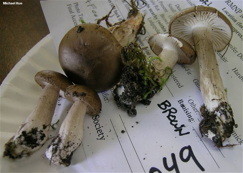 Hygrophorus pustulatus [ Basidiomycota > Agaricales > Hygrophoraceae > Hygrophorus . . . ] by Michael Kuo Hygrophorus pustulatus features a grayish brown cap, white gills that begin to run down the stem, and a whitish stem that is "pustulate" (covered with little brown dots that are reminiscent of the glandular dots found on the stems of many Suillus species). It is associated with conifers--especially with firs--in western North America and in the northern regions of central and eastern North America. Western versions, like the specimens described and illustrated here, are more robust than eastern versions, and feature larger spores; they may constitute a separate species. Description: Ecology: Mycorrhizal with conifers--particularly with firs, but also reported in association with Engelmann spruce and with redwood; late summer and fall; common from the Rocky Mountains westward, and occasional in north-central and northeastern North America. The illustrated and described collection is from Colorado. Hygrophorus tephroleucus, sometimes considered a synonym of Hygrophorus pustulatus, is separated on the basis of its more slender stature and less conspicuous stem ornamentation. Cap: 2-4 cm; convex when young, becoming broadly convex or slightly bell-shaped; sticky when fresh; with a slightly streaked appearance from stretched-out fibers beneath the slime; shiny when dried out; brown to gray-brown; lighter towards the margin. Gills: Beginning to run down the stem; close or nearly distant; white; waxy. Stem: 3-7 cm long; up to 1.5 cm thick; more or less equal; when very fresh and young sheathed with slime over the lower portion, but soon dry; whitish; covered with tiny fibrous points (especially over the upper half) that darken to grayish brown with maturity or when the mushroom is dried. Flesh: White; unchanging when sliced. Odor and Taste: Not distinctive. Spore Print: White. Microscopic Features: Spores 8-11.5 x 4-5.5 µ; smooth; ellipsoid; hyaline in KOH; inamyloid. Hymenial cystidia absent. Lamellar trama divergent. Pileipellis an ixocutis with clamp connections present. REFERENCES: (Persoon, 1801) Fries, 1838. (Fries, 1821; Saccardo, 1887; Hesler & Smith, 1963; Bird & Grund, 1979; Largent, 1985; Phillips, 1991/2005; McNeil, 2006; Lodge et al., 2013.) DBG RMNP 2008-049. This website contains no information about the edibility or toxicity of mushrooms. |
