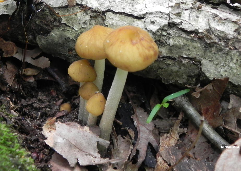 Hymenopellis sinapicolor [ Basidiomycota > Agaricales > Physalacriaceae > Hymenopellis . . . ] by Michael Kuo Originally collected by amateur mycologist Jay Justice in Arkansas, Hymenopellis sinapicolor is a small-spored, yellow-capped xeruloid mushroom recently designated (Petersen & Hughes, 2010) as a separate species supported by both mating and DNA analysis. I made the illustrated collection in Illinois, where the species was growing alongside whitish and brownish specimens of Hymenopellis incognita, around the same hickory stump. Since many of the xeruloid species are quite variable in color, I assumed all the specimens on the stump represented the same species--until, three and a half years later, I examined them under the microscope, where the yellow-capped specimens had significantly smaller spores and different cystidia. Older field guides probably combined Hymenopellis sinapicolor with what have since been designated as separate species of Hymenopellis, in treatments of "Collybia radicata," "Oudemansiella radicata," and "Xerula radicata." Description: Ecology: Saprobic on the deadwood of hardwoods; attached to buried deadwood near stumps and logs, appearing terrestrial; late spring; distribution uncertain. Originally described from Arkansas; illustrated and described here from Illinois. Cap: 3-5 cm; bell-shaped when young, becoming broadly bell-shaped to broadly convex or nearly flat in age; bald; somewhat radially wrinkled; sticky to greasy when young, but soon dry; honey yellow to mustard yellow. Gills: Attached to the stem by means of a notch and a tiny tooth that runs down the stem; distant or nearly so; white; short-gills frequent. Stem: 5-9 cm long above ground; 0.5-1 cm thick; tapering to apex; bald or finely fibrillose; whitish; with a tapering tap root extending up to 4 cm underground. Flesh: White; thin; unchanging when sliced. Odor and Taste: Not distinctive. Chemical Reactions: KOH on cap surface negative. Dried Specimens: Gills of dried specimens become pale pastel orange after several years in storage. Spore Print: White. Microscopic Features: Spores 9-12 x 6-8 µ; ellipsoid at maturity; smooth; inamyloid; hyaline in KOH. Hymenial elements of herbarium specimens mostly hyaline in KOH. Pleurocystidia fusoid-ventricose to widely fusoid-ventricose; usually with a neck or mucro; occasionally subcapitate; thin-walled; hyaline; smooth; to 100 x 35 µ. Cheilocystidia similar to pleurocystidia. Pileipellis hymeniform and somewhat gelatinized; pileocystidia thin-walled, hyaline, up to 95 x 25 µ. REFERENCES: R. H. Petersen & J. Justice, 2010. (Petersen & Hughes, 2010.) Herb. Kuo 05241104. This website contains no information about the edibility or toxicity of mushrooms. |