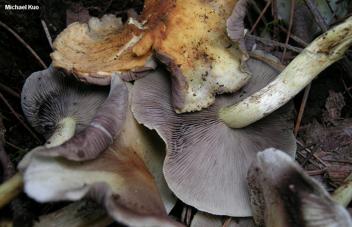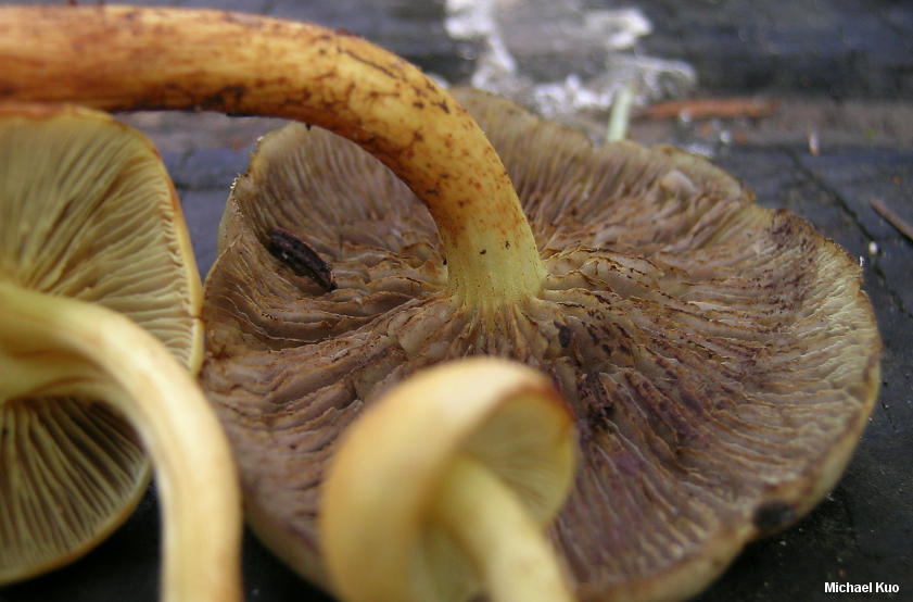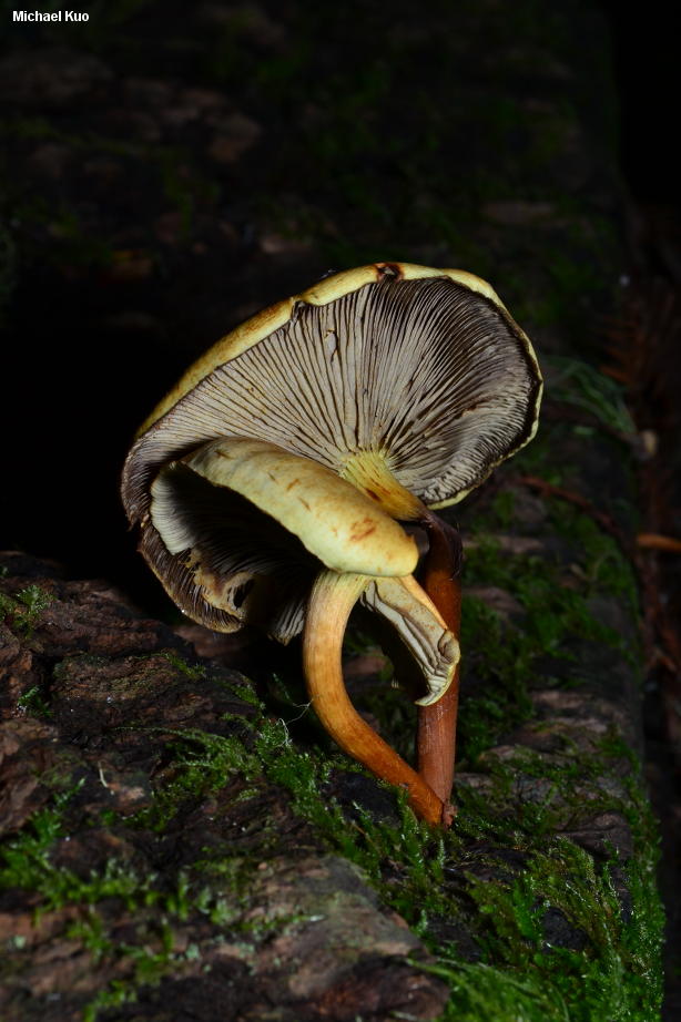 Hypholoma fasciculare [ Basidiomycota > Agaricales > Strophariaceae > Hypholoma . . . ] by Michael Kuo This widely distributed mushroom is often found in colder weather, fruiting in large, striking clusters on the deadwood of conifers or, more rarely, hardwoods. When fresh, the clustered caps are usually described as being bright yellow to greenish yellow—as are the gills and stems—but the cap colors are extremely variable and, in my collecting experience, the photogenic yellow specimens one sees in field guides are actually less commonly encountered than specimens demonstrating a slew of other cap colors: reddish brown, orangish brown, orange, brownish, and even whitish when specimens are very mature. The spore print is purple-brown, and with older specimens you can frequently check this out in the field, due to the clustered growth pattern, by simply lifting a few caps that have covered others. Hypholoma subviride is virtually identical, but has smaller caps (measuring 1–3 cm across). It appears to be limited to tropical and subtropical areas; in the United States it is known only from the southeastern states, the southern Appalachians, and the Ozarks. Naematoloma fasciculare is a synonym. Description: Ecology: Saprobic; growing in clusters on decaying logs and stumps of conifers and, rarely, hardwoods; fall and winter, sometimes in spring; widely distributed in North America, but more common along the West Coast and in montane or northern areas. The illustrated and described collections are from California, Colorado, and Illinois. Cap: 2-5 cm; convex, becoming broadly convex or nearly flat; bald; dry; when young often tawny reddish brown or orange, but usually becoming bright yellow to greenish yellow or golden yellow, with a darker center; the margin often featuring small, wispy partial veil fragments. Gills: Attached to the stem or pulling away from it; close or crowded; yellow, becoming olive or greenish yellow, and eventually dusted with spores and therefore spotted purplish brown to blackish; short-gills frequent. Stem: 3-10 cm long; 4-10 mm thick; more or less equal, or tapering to base; bright yellow to tawny; developing rusty brown stains from the base upwards; a bright yellow cortina present in buttons, but soon disappearing or leaving a faint ring zone. Flesh: Thin, yellow. Odor and Taste: Odor not distinctive; taste bitter. Spore Print: Purple brown. Microscopic Features: Spores: 5-8 x 3-4.5 µ; ellipsoid; smooth; thin-walled; with a pore; yellowish in KOH. Pleuro-chrysocystidia fusoid-ventricose to mucronate; to 40 x 10 µ. Pileipellis a cutis or ixocutis; elements encrusted. REFERENCES: (Hudson, 1778) Kummer, 1871. (Fries, 1821; Saccardo, 1887; Smith, 1949; Smith, 1951; Smith, 1975; Stamets, 1978; Smith, Smith & Weber, 1979; Weber & Smith, 1985 [H. subviride]; Arora, 1986; Phillips, 1991/2005; Lincoff, 1992; Metzler & Metzler, 1992; Evenson, 1997; Barron, 1999; Roody, 2003; McNeil, 2006; Miller & Miller, 2006; Trudell & Ammirati, 2009.) Herb. Kuo 10029601. This website contains no information about the edibility or toxicity of mushrooms. |