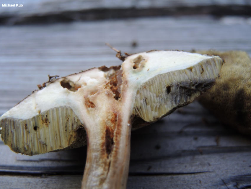 [ Basidiomycota > Boletales > Boletaceae > Imleria . . . ] Imleria badia by Michael Kuo, 21 June 2023 Although several of its defining features can vary between collections, Imleria badia is a fairly easily recognized bolete. Originally described from Europe, it is also found in the conifer forests of northeastern North America, the upper Midwest, and the Appalachians, often fruiting from or around very decayed wood—and the "bay brown" color of its cap and stem contrasts elegantly with the pale yellow pore surface, which bruises bluish or grayish. The surface of the stem is distinctive, in my opinion, but is hard to describe. While the stem is not reticulate, it is also not smooth; broad, shallow wrinkles cover at least the midportion when the mushroom is young. Thanks to Django Grootmyers for documenting, collecting, and preserving Imleria badia for study; his collection is deposited in The Herbarium of Michael Kuo. Boletus badius and Xerocomus badius are former names. Description: Ecology: Mycorrhizal with conifers (especially pines and eastern hemlock), and sometimes reported under beech (especially in Europe) and birch; growing alone, scattered, or gregariously, often from or in the vicinity of well-decayed, mossy stumps; summer and fall; widely distributed in northeastern North America, the upper Midwest, and the Appalachians; also found in Mexico and Europe. The illustrated and described collections are from France, Maine, and Michigan. Cap: 3–9 cm; convex, becoming broadly convex; sticky when fresh, but soon dry; bald, with a kid-leathery feel; brown to pinkish brown or reddish brown; margin with a tiny (1–2 mm) overhanging sterile portion. Pore Surface: Pale dull yellow, becoming yellow and eventually dirty yellowish brown; bruising grayish blue; 2–3 pores per mm at maturity; tubes to 1 cm deep, olive at maturity, xerocomoid. Stem: 5–18 cm long; 1.5–4 cm thick; enlarged at the base; usually somewhat wrinkled, shallowly and longitudinally; bald; not reticulate; pale yellowish to pale brownish near the apex; brown to reddish brown below; basal mycelium white. Flesh: White overall, but sometimes pale yellow just above the tubes; unchanging when sliced, or slowly bluish pink under the cap cuticle. Odor and Taste: Odor not distinctive; taste slightly soapy. Chemical Reactions: Ammonia black on cap surface, sometimes with an initial blue-green flash; negative on flesh. KOH blackish maroon or orange on cap surface; pale orange on flesh. Iron salts negative or blackish olive on cap surface; negative to grayish on flesh. Microscopic Features: Spores 11–15 x 4–6 µm (sometimes longer when 2-spored basidia are present); boletoid-fusiform; smooth; ochraceous in KOH. Basidia 2- or 4-sterigmate. Hymenial cystidia 40–50 x 7–10 µm; lageniform to mucronate; smooth; thin-walled; hyaline in KOH. Pileipellis a collapsing and sometimes gelatinizing trichoderm; elements 5–7.5 µm wide, smooth, hyaline to ochraceous or golden in KOH; terminal cells cylindric with rounded apices. REFERENCES: Fries, 1821. (Saccardo, 1888; Coker & Beers, 1943; Snell & Dick, 1970; Smith & Thiers, 1971; Grund & Harrison, 1976; Phillips, 1981; Smith, Smith & Weber, 1981; Breitenbach & Kränzlin, 1992; Phillips, 1991/2005; Lincoff, 1992; Both, 1993; Barron, 1999; Bessette, Roody & Bessette, 2000; Nonis, 2001; Roody, 2003; McNeil, 2006; Miller & Miller, 2006; Ŝutara, 2008; Buczacki et al., 2012; Nuhn et al., 2013; Kuo & Methven, 2014; Wu et al., 2014; Zhu et al., 2014; Bessette et al., 2016; Wu et al., 2016; Baroni, 2017; Gminder & Böhning, 2017; Kibby, 2017; Knudsen & Taylor, 2018; Noordeloos, 2018; Læssøe & Petersen, 2019; Farid et al., 2020; Kibby, 2020; Kuo & Ortiz-Santana, 2020; McKnight et al., 2021.) Herb. Kuo 09110404, 07211503, 08112008. This site contains no information about the edibility or toxicity of mushrooms. |
