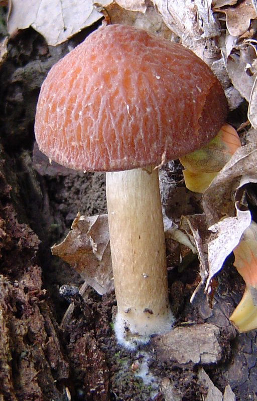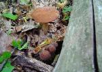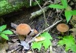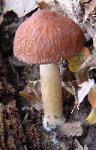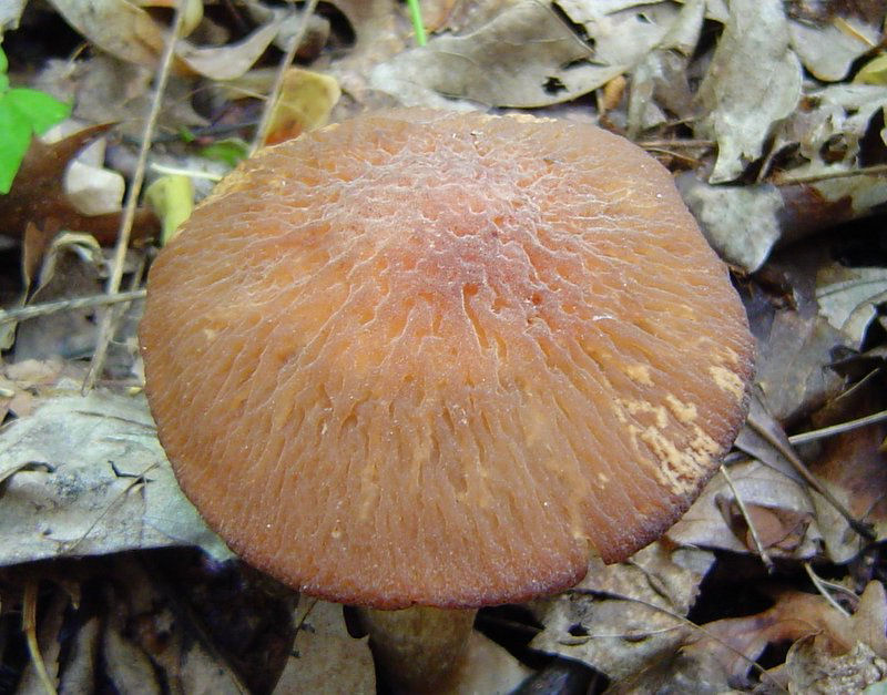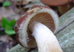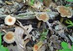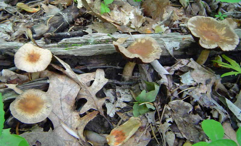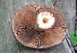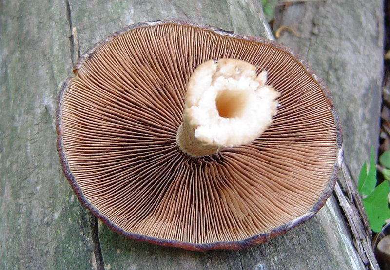 | Found May 20th after several days of rain. Growing from well-rotted wood. Note corrugated cap, hollow stem, attached gills and white partial-veil remnants on cap margin. |