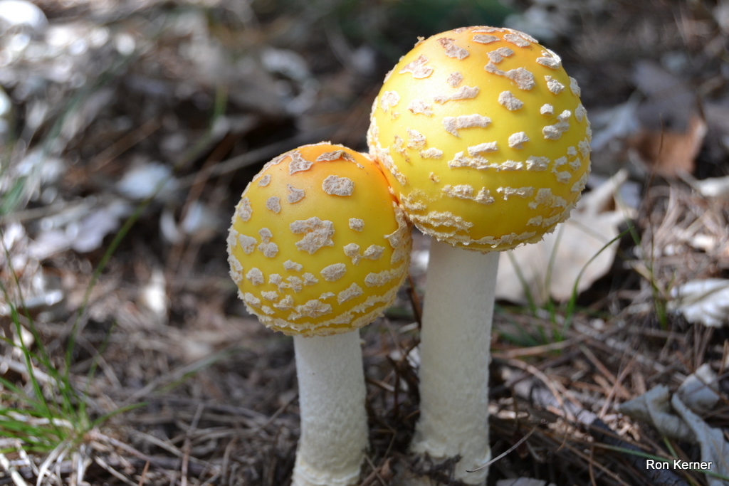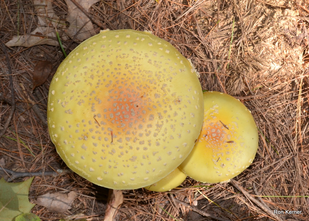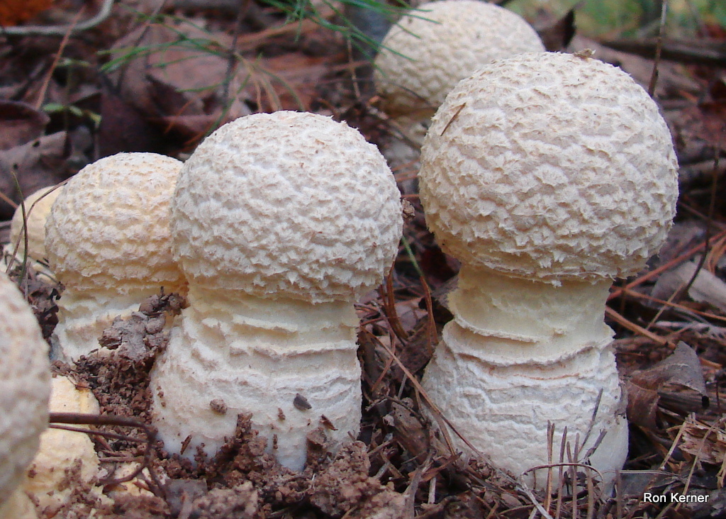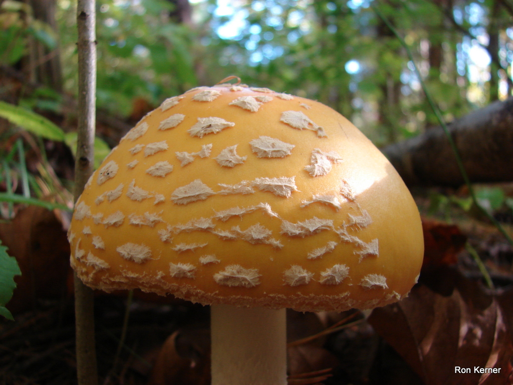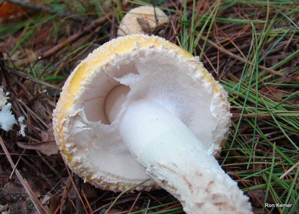Yellow Fly Agaric. Poisonous. Found late summer into early fall, sometimes in spring; growing from ground beneath pine trees. Young mushrooms (up to 8cm tall; about 3 inches) are completely covered with a soft cottony material that breaks away, leaving remnants of itself on the cap as the mushroom grows. |