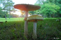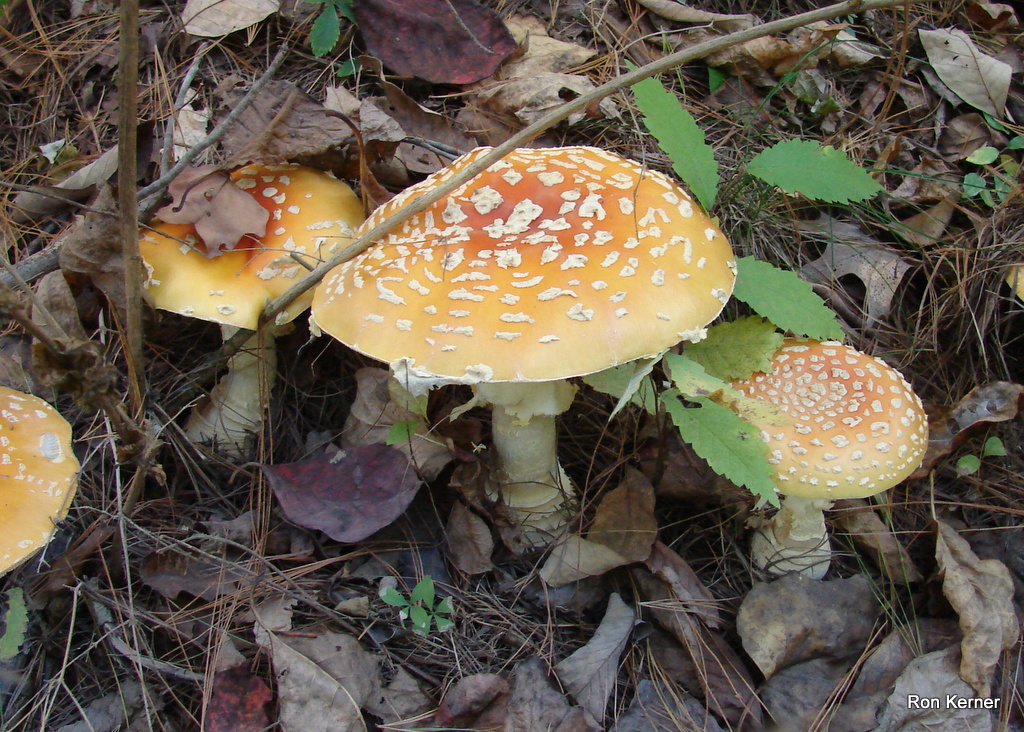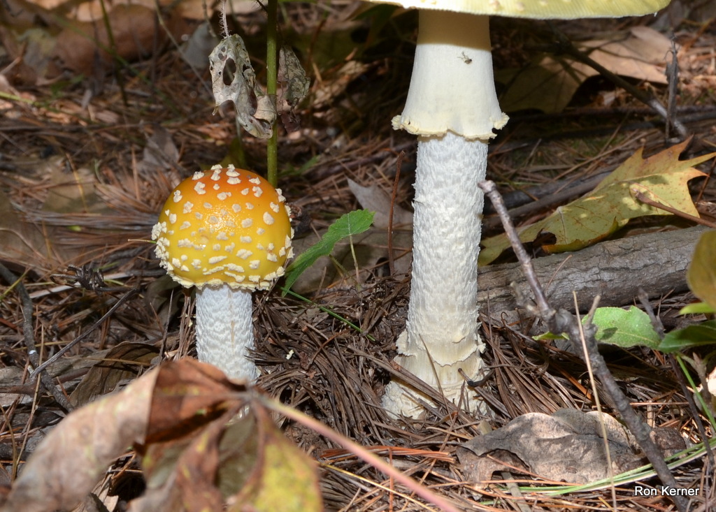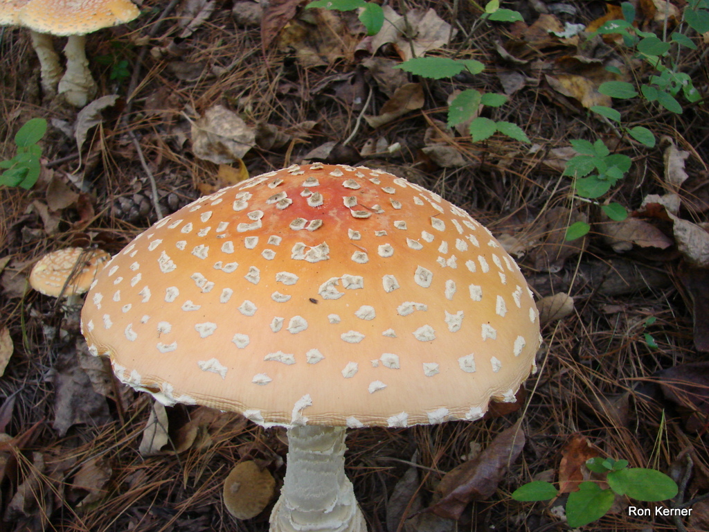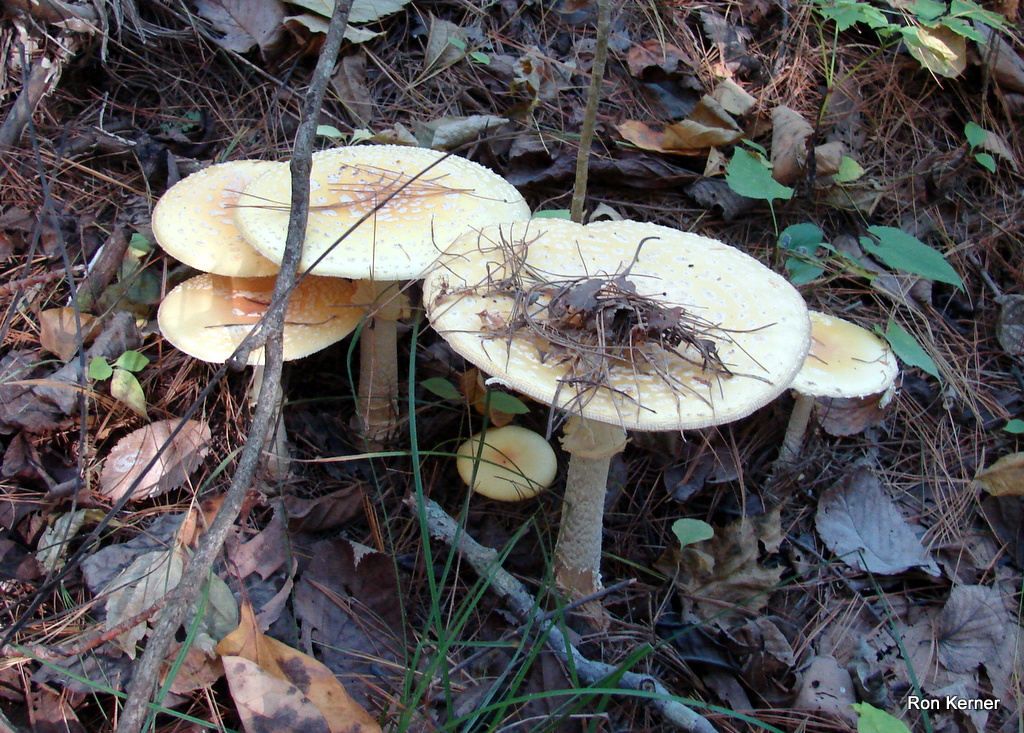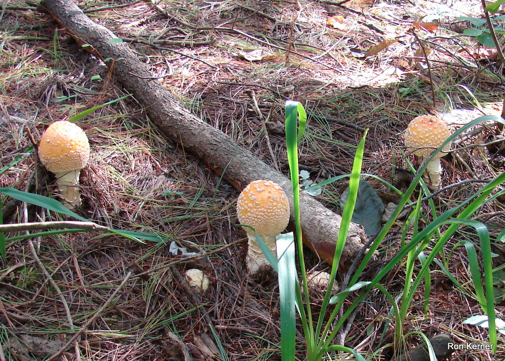 Yellow Fly Agaric. Poisonous. Found late summer into early fall, sometimes in spring; growing from ground beneath pine trees. Young mushrooms (up to 8cm tall; about 3 inches) are completely covered with a soft cottony material that breaks away, leaving remnants of itself on the cap as the mushroom grows. |