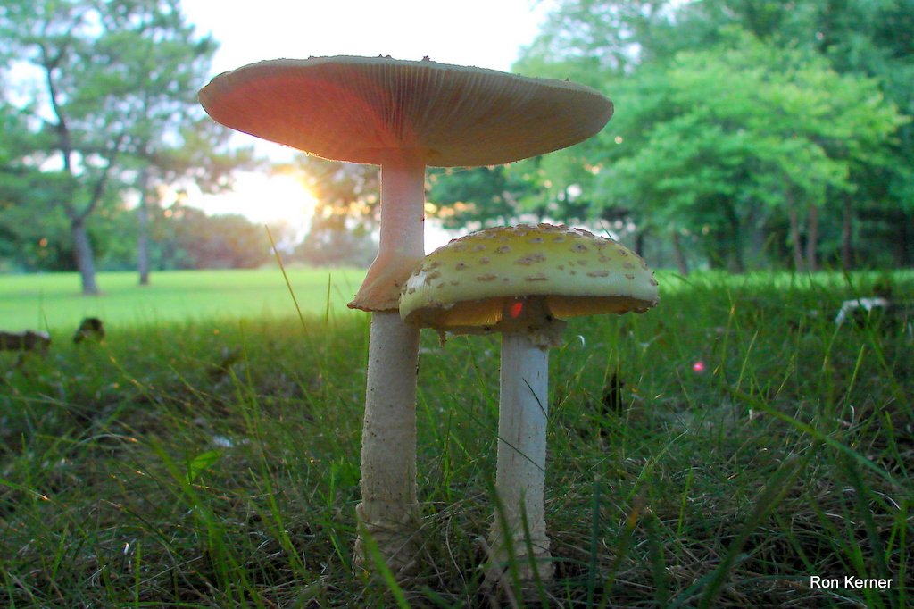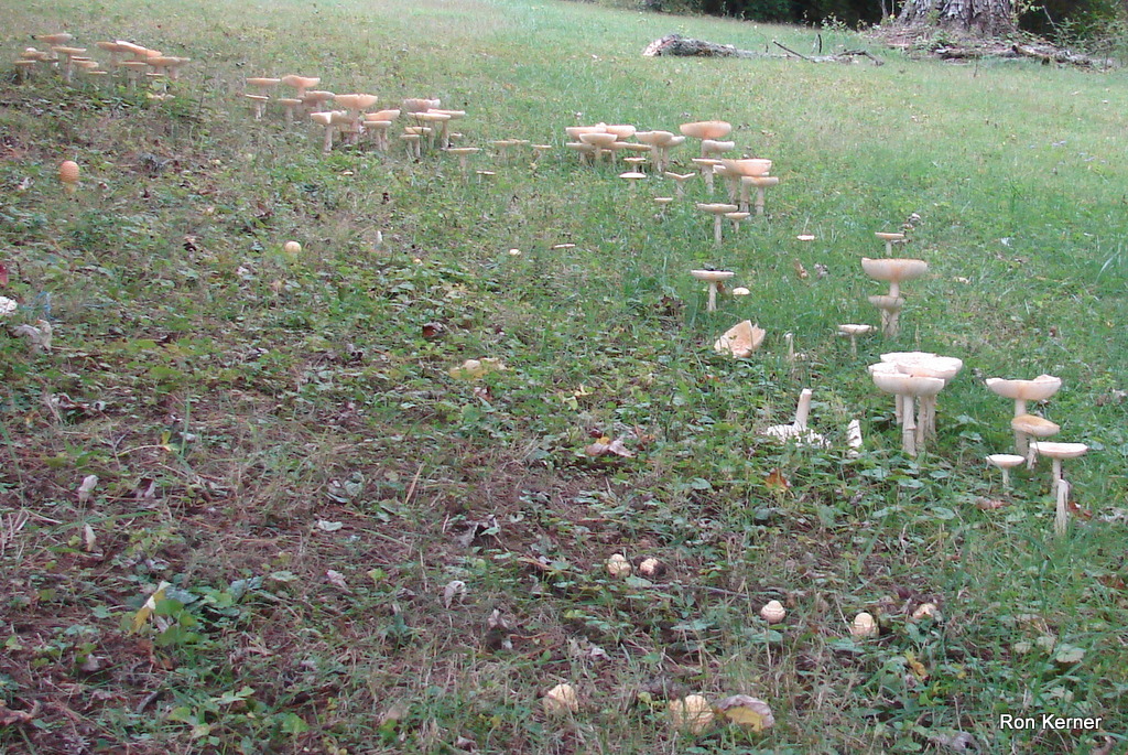 The young gills are protected by a partial veil that falls away as the cap expands, leaving a skirt-like ring on the stem. Note yellow fringe on ring. Basal bulb is roundish, often with concentric rings at the base of the stem. |