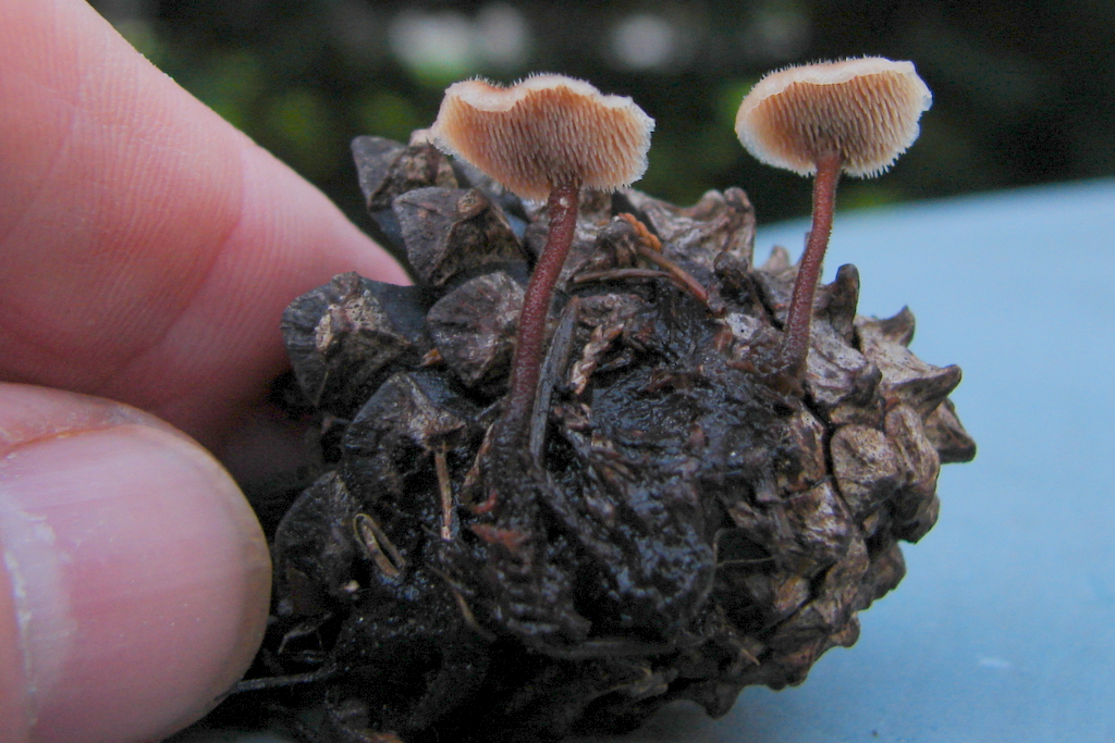 | Michael Kuo of MushroomExpert.Com calls this little mushroom "goofy", and it is. But it is also cute as a button and about the same size. Although said to be common, you really have to look for it specifically. Just check out every pine cone lying on the ground and, sooner or later, you'll be rewarded with this goofy little toothed mushroom. Took me ten years of pine cones. This collection was found in August growing from a pine cone; also found on the cones of Douglas fir. Cap and stem have a tough consistency and are finely hairy. Teeth are white, brown with age. Stem is laterally placed, not centered. Spore print white. |