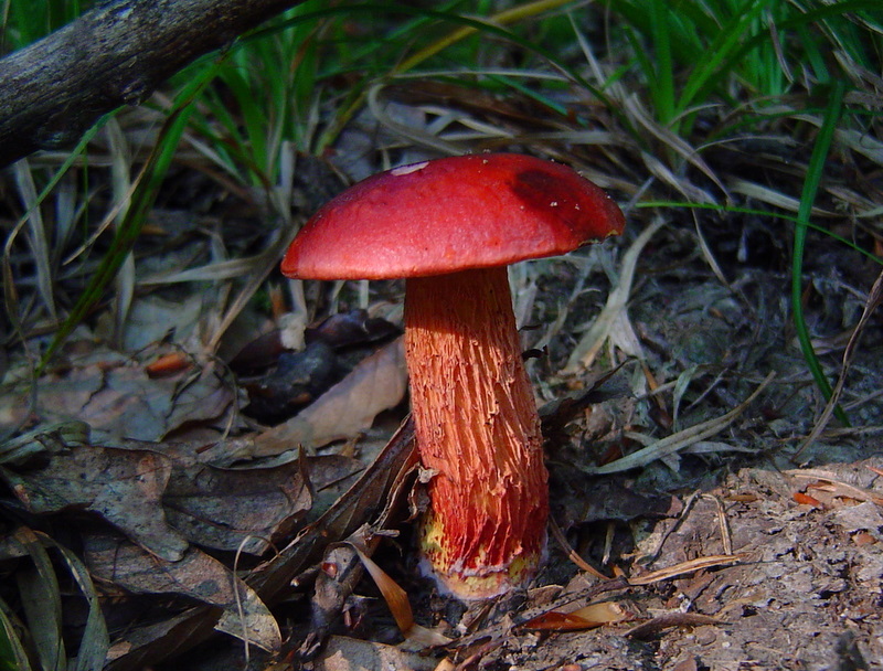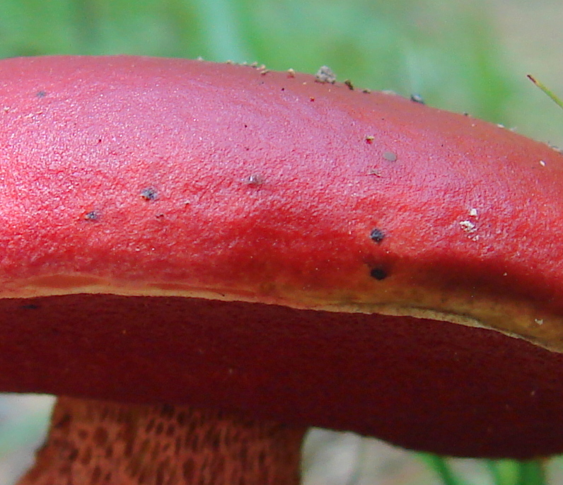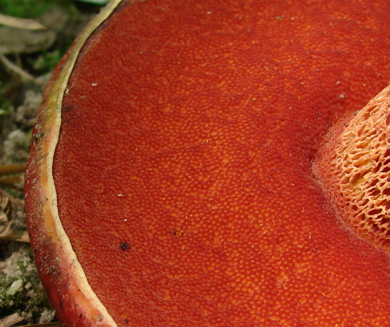| This Bolete mushroom is associated with oak trees; mid to late summer. Olive brown spore print. Exudes a clear yellow liquid when young and fresh. Deep, soft reticulation covers the stem. Vivid colors of red, yellow and orange. One of the most visually fascinating mushrooms out there. Boletus frostii and Exsudoporus frostii are synonyms. |
