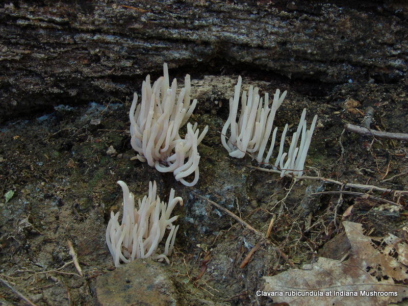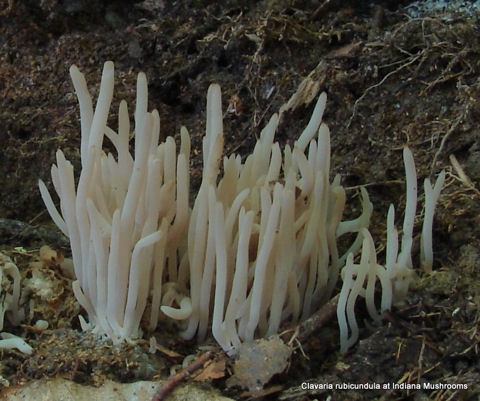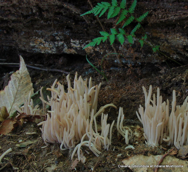 | This group of suspected Clavaria rubicundula was found growing from the ground in a hardwood forest; August. Very brittle; exhibits reddish or pinkish tones near the base; grows in dense clusters. Spore print is white. |
