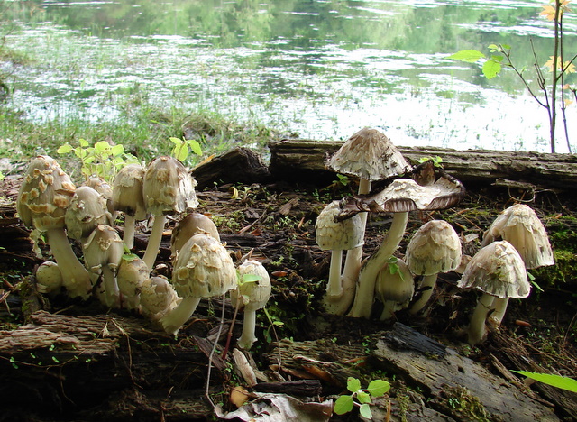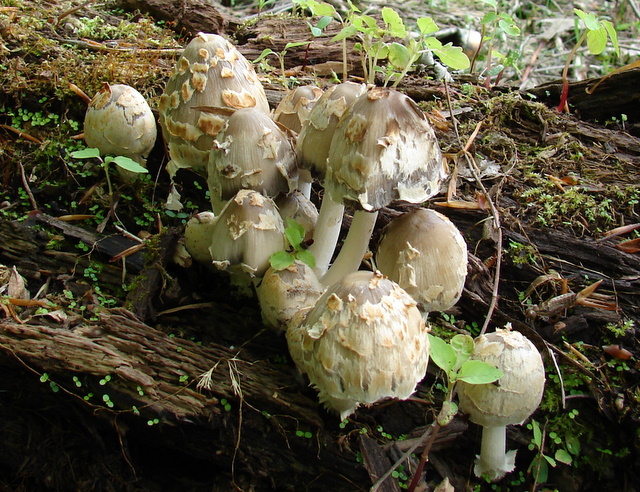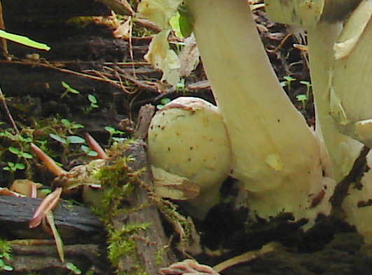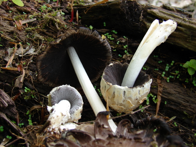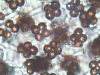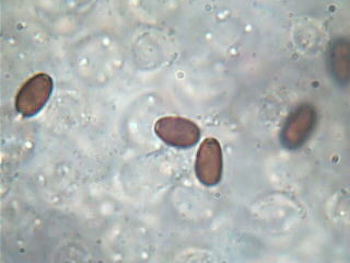 | Coprinopsis variegata spores with four-pronged basidia cells in background. |