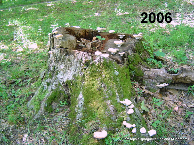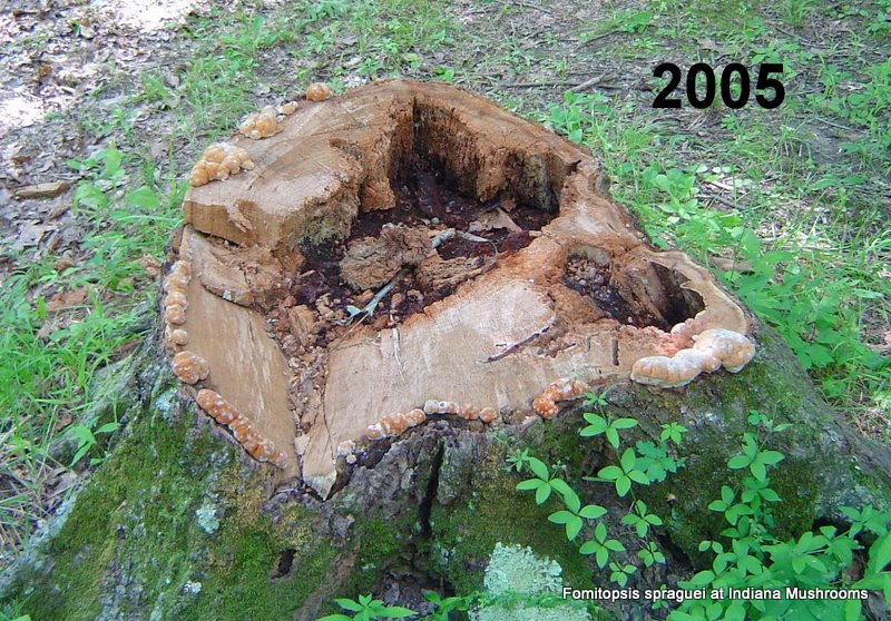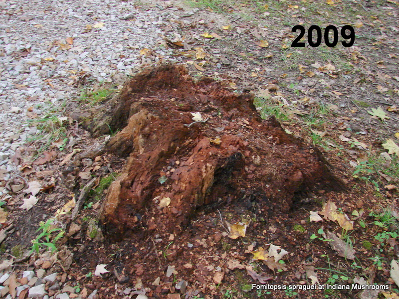 | Formerly Fomitopsis spraguei. Niveoporofomes spraguei made quick work of this oak stump. A brown rot fungus that degrades cellulose in its search for food, leaving behind lignin. |