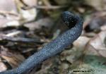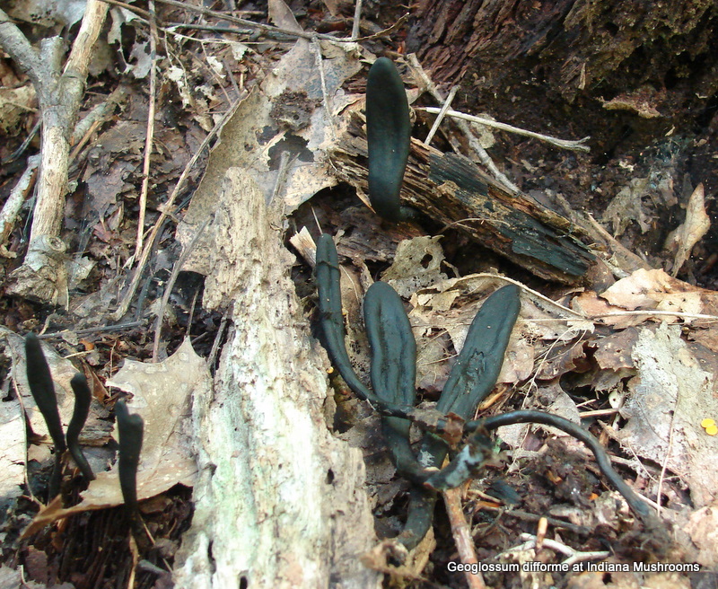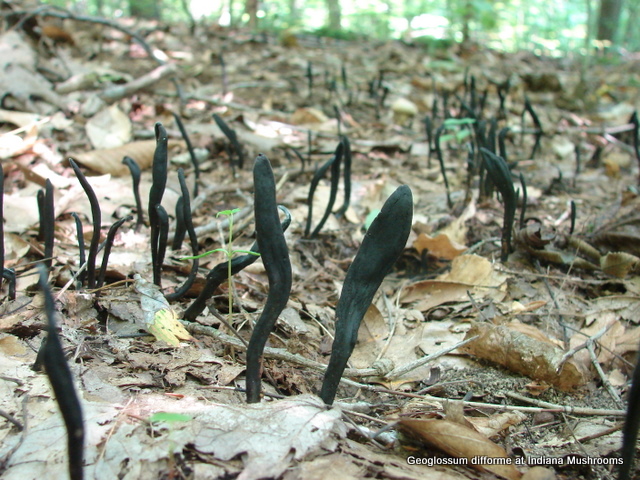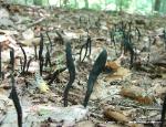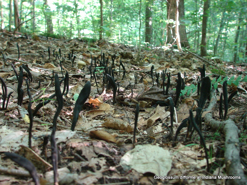 This troop of black earth tongues (over 100) were found in July growing from the ground in a hardwood forest. Fruiting body sometimes moist and viscid. Most of these specimens are 2.5-5cm tall (1-2 inches). |