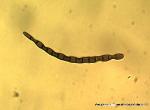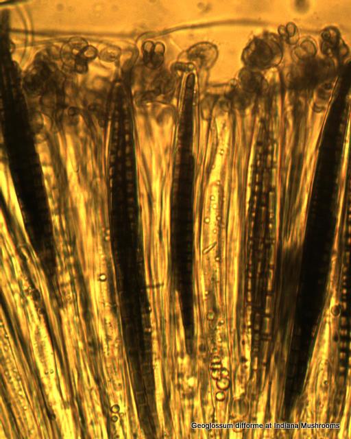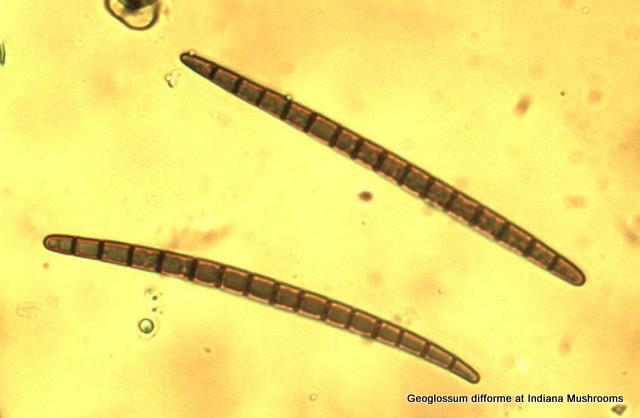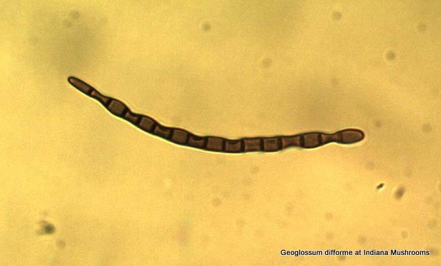 The mature spores of Geoglossum difforme are mostly 15 septate and range from 75-125 microns in length. |