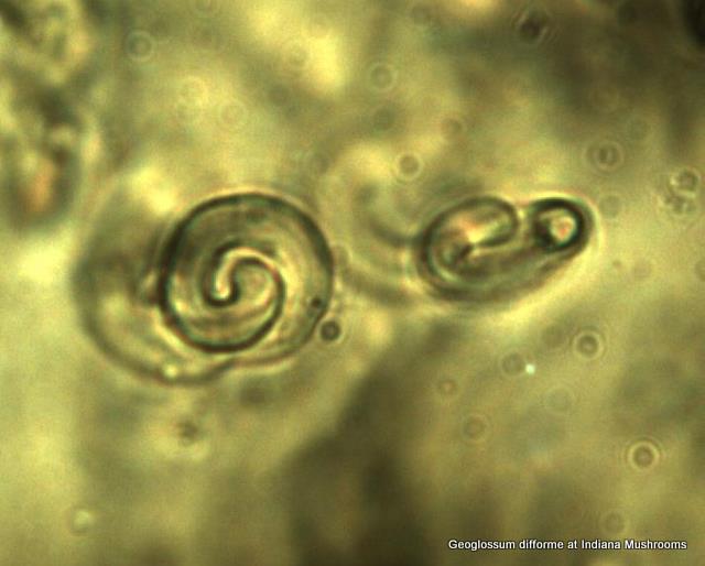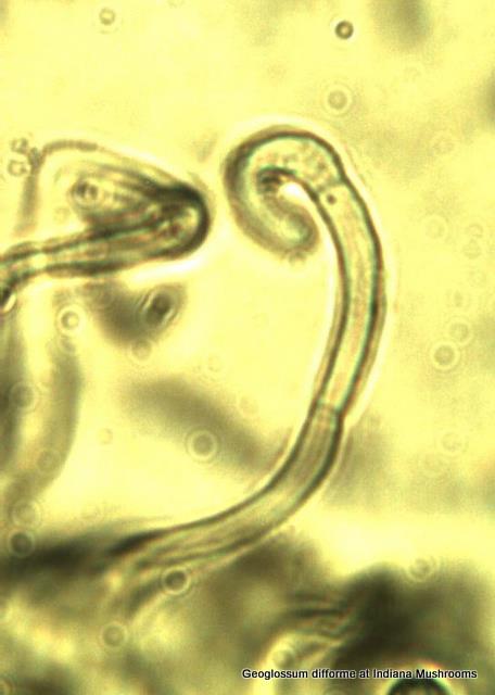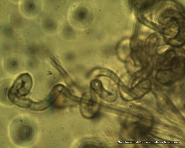 The paraphyses of Geoglossum difforme are abundant, septate and tightly coiled at the tip. These cells give this earth tongue its sticky surface when moist and velvety look when dry and possibly provide protection to developing spores. |