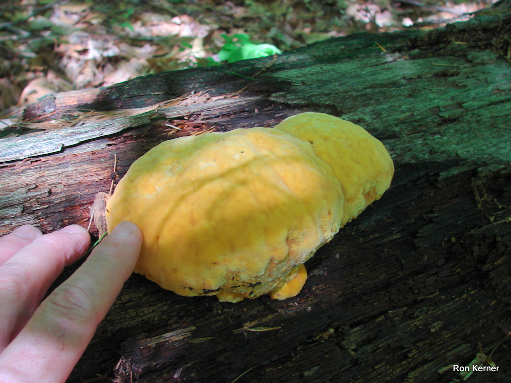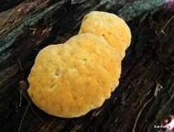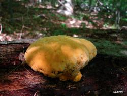 | This odd orange/yellow lump of a fungus fruits on hardwood logs during summer and fall. Soft, fuzzy outer surface. Inner flesh zonate. Purple reaction with KOH. Spores measure 7–8 x 4–5 microns. |