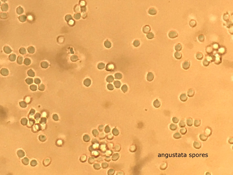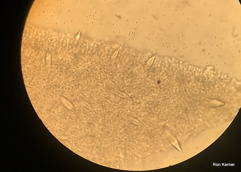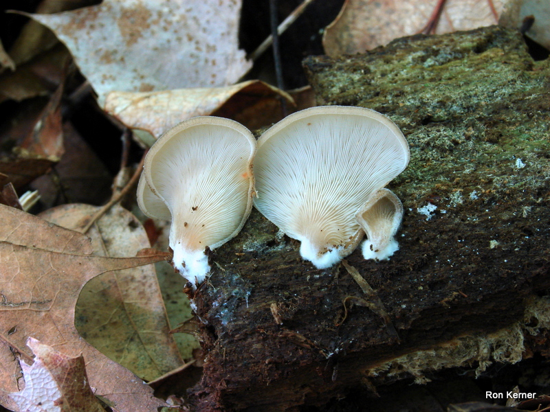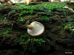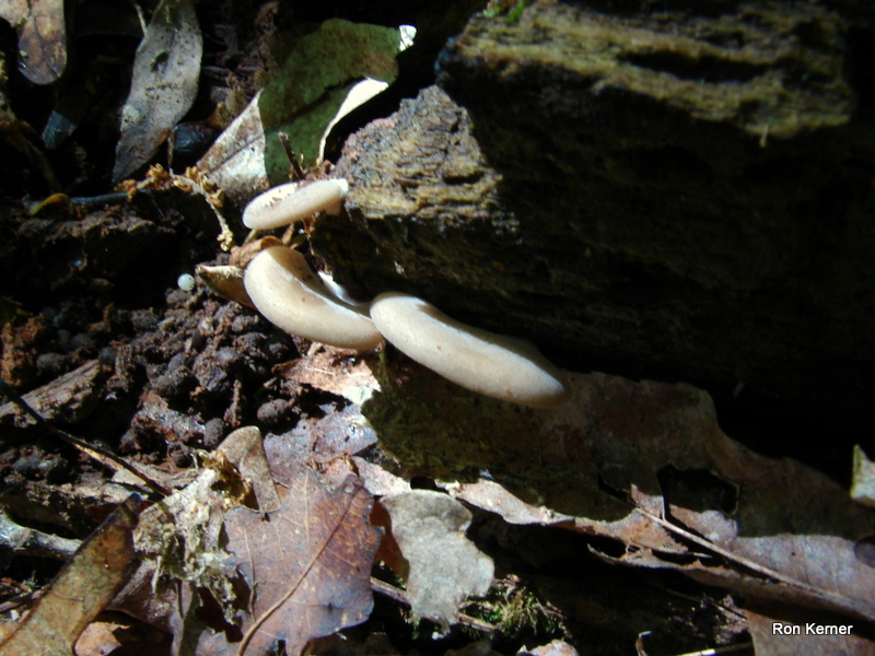 | This ho-hum Hohenbuehelia grows in a shelf-like manner from rotting hardwood logs. Cap light brown, whitish, sometimes a dingy grey. Close, off-white gills. Rubbery texture. Similar to some Crepidotus mushrooms, but Crepidotus mushrooms have a brown spore print. Spore print white with Hohenbuehelia. |